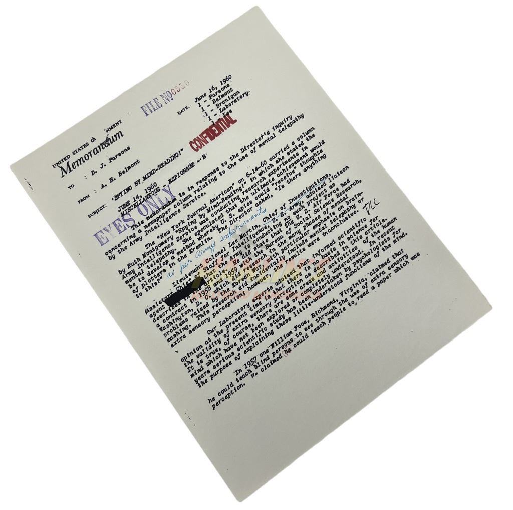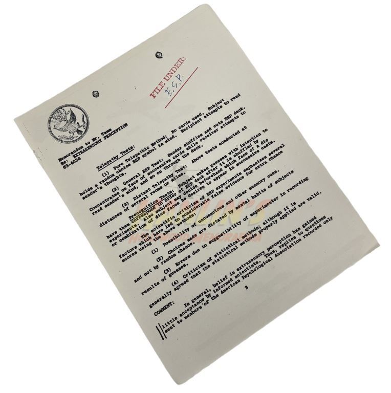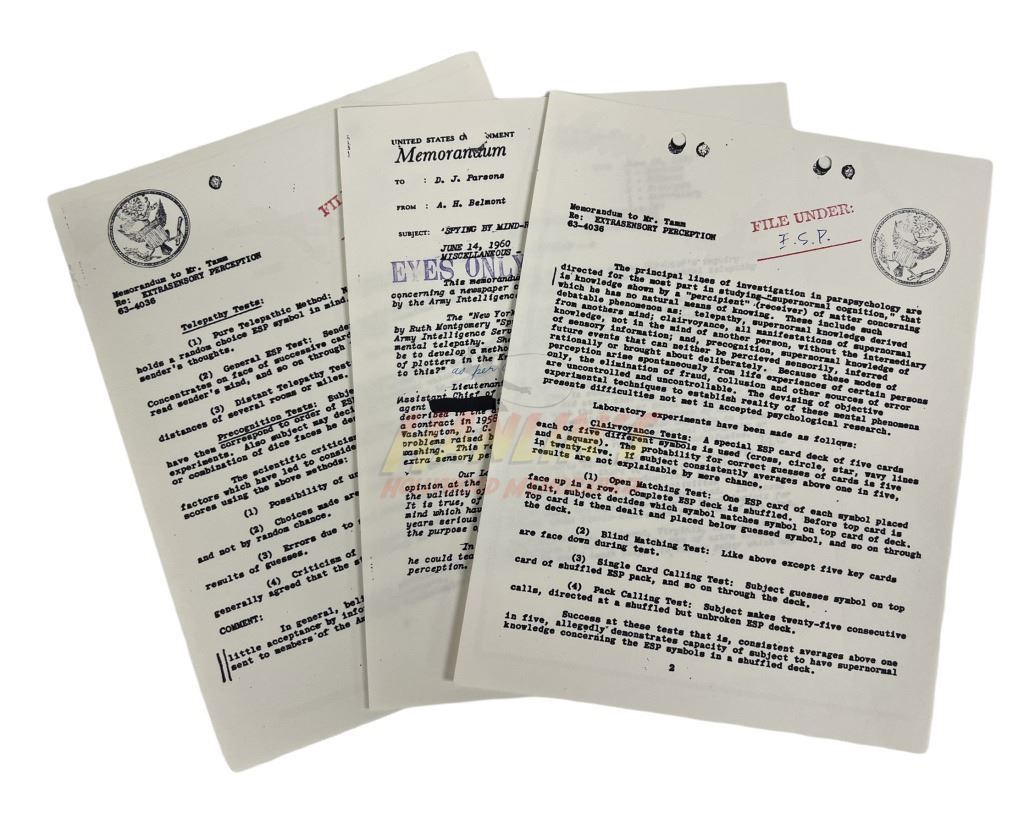 Original set of 3 pages from the President's Book relating to ESP & telepathy used on the production of the Jerry Bruckheimer produced action-adventure film 'National Treasure: Book of Secrets' (2007), where Benjamin Gates (Cage) must follow a clue left in John Wilkes Booth's diary to prove his ancestor's innocence in the assassination of Abraham Lincoln.