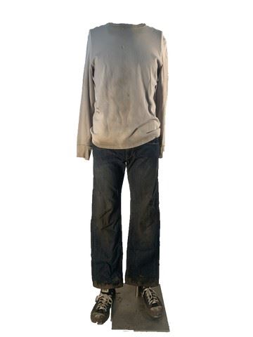 National Treasure: Book of Secrets (2007) - Riley (Justin Bartha) screen worn, stage 5, muddy effect, costume with "Banana Republic" (S) thermal long sleeve top, "Levi's Capital" Jeans (32), and "Converse" muddied shoes (9 1/2). Grey and black socks included. Also included, a pair of black underwear for water work. Includes wardrobe tags. This amazing memorabilia comes direct from the Debbie Reynold's archive collection.