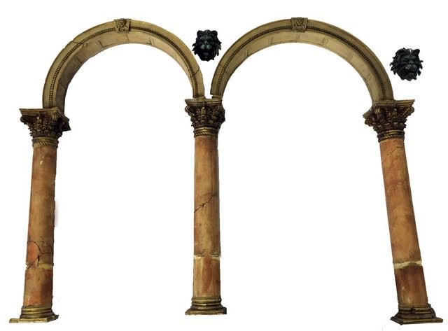 This set of decorative Arches, Columns and Lion Head Grotesques were used to shore-up the walls in the Treasure Room. The arches are "gilded", with the columns hand painted as red marble with bronze finished Lion Heads. 54" long x 38" wide. 1:6 ratio. This incredible, handmade miniature is from the celebrated collection of Academy Award winning New Deal Studios. New Deal Studios is a 21st Century Media Studio, unlike any in the world. A full-service film production and visual effects studio, with over 20 years of iconic imagery, New Deal Studios develops, designs, prototypes, and creates all types of high caliber media projects. Founded in 1995 by Matthew Gratzner, Ian Hunter and Shannon Blake Gans, this artist owned and operated independent studio, born in the heyday of visual effects, has truly evolved into the technology driven studio for the future, consistently delivering the perfect marriage of artistry and technology. Award winning credits by New Deal Studios include high-profile projects such as Dark Knight Rises, Hugo, The Avengers, Oz the Great and Powerful, Iron Man, The Dark Knight, Watchmen, I am Legend, Night at the Museum, Whiteout, 2012, Alice in Wonderland, Inception, Battleship and Interstellar.