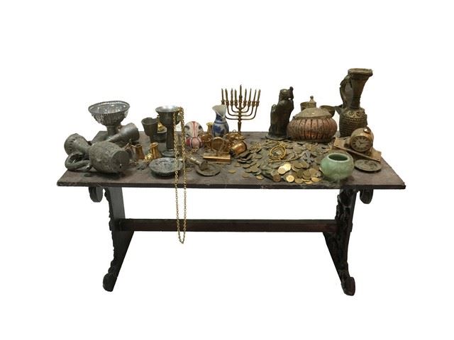 For the climactic scene of Nicolas Cage's character Benjamin Franklin Gates, discovering his family's life long quest for the legendary treasure, a one-sixth scale miniature treasure room was created. This screen used miniature represent meticulously researched and crafted artifacts featuring artifacts featuring a table filled with miniature goblets, porcelain ware and Japanese theater masks. Fabricated from balsa wood, cast urethane and brass. 13" long x 9" tall. 1:6 ratio. This incredible, handmade miniature is from the celebrated collection of Academy Award winning New Deal Studios. New Deal Studios is a 21st Century Media Studio, unlike any in the world. A full-service film production and visual effects studio, with over 20 years of iconic imagery, New Deal Studios develops, designs, prototypes, and creates all types of high caliber media projects. Founded in 1995 by Matthew Gratzner, Ian Hunter and Shannon Blake Gans, this artist owned and operated independent studio, born in the heyday of visual effects, has truly evolved into the technology driven studio for the future, consistently delivering the perfect marriage of artistry and technology. Award winning credits by New Deal Studios include high-profile projects such as Dark Knight Rises, Hugo, The Avengers, Oz the Great and Powerful, Iron Man, The Dark Knight, Watchmen, I am Legend, Night at the Museum, Whiteout, 2012, Alice in Wonderland, Inception, Battleship and Interstellar.
