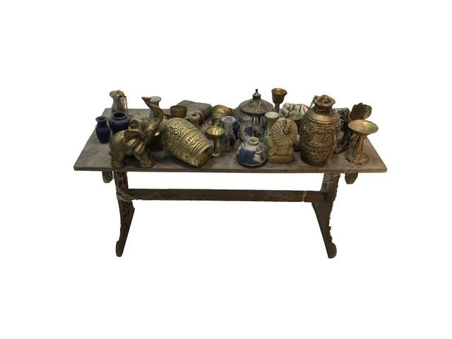 This screen used treasure room artifact is a table featuring with miniature goblets, porcelain ware and a brass menorah. Fabricated from balsa wood, cast urethane and brass. 13" long x 9" tall. 1:6 ratio. This incredible, handmade miniature is from the celebrated collection of Academy Award winning New Deal Studios. New Deal Studios is a 21st Century Media Studio, unlike any in the world. A full-service film production and visual effects studio, with over 20 years of iconic imagery, New Deal Studios develops, designs, prototypes, and creates all types of high caliber media projects. Founded in 1995 by Matthew Gratzner, Ian Hunter and Shannon Blake Gans, this artist owned and operated independent studio, born in the heyday of visual effects, has truly evolved into the technology driven studio for the future, consistently delivering the perfect marriage of artistry and technology. Award winning credits by New Deal Studios include high-profile projects such as Dark Knight Rises, Hugo, The Avengers, Oz the Great and Powerful, Iron Man, The Dark Knight, Watchmen, I am Legend, Night at the Museum, Whiteout, 2012, Alice in Wonderland, Inception, Battleship and Interstellar.