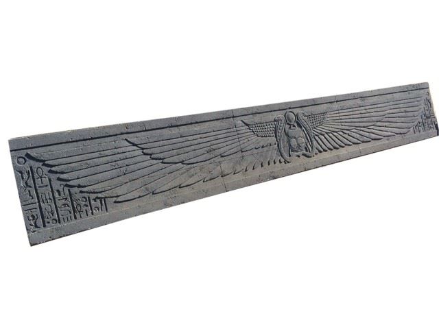 This is an original rigid foam hand sculpted bas relief frieze of an Egyptian Winged Scarab. This pattern was then molded and cast to create sections of architecture in the treasure room. 56" long x 8" tall. 1:6 ratio. This incredible, handmade miniature is from the celebrated collection of Academy Award winning New Deal Studios. New Deal Studios is a 21st Century Media Studio, unlike any in the world. A full-service film production and visual effects studio, with over 20 years of iconic imagery, New Deal Studios develops, designs, prototypes, and creates all types of high caliber media projects. Founded in 1995 by Matthew Gratzner, Ian Hunter and Shannon Blake Gans, this artist owned and operated independent studio, born in the heyday of visual effects, has truly evolved into the technology driven studio for the future, consistently delivering the perfect marriage of artistry and technology. Award winning credits by New Deal Studios include high-profile projects such as Dark Knight Rises, Hugo, The Avengers, Oz the Great and Powerful, Iron Man, The Dark Knight, Watchmen, I am Legend, Night at the Museum, Whiteout, 2012, Alice in Wonderland, Inception, Battleship and Interstellar.
