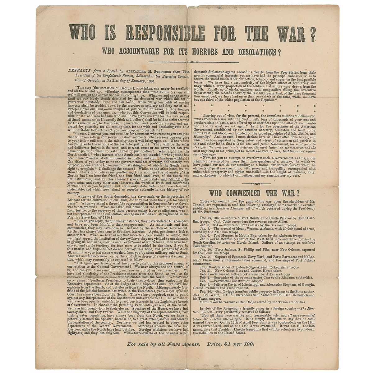 Dramatically titled printed broadside, headed “Who is Responsible for the War? Who is Accountable for Its Horrors and Desolation?,” one page, 9.25 x 11.25, no date but issued during the summer of 1864 during President Lincoln’s reelection campaign. An excerpt from a speech made by Confederate Vice President Alexander H. Stephens, delivered at the Secession Convention of Georgia on January 31, 1861, also providing a timeline of actions leading up to the Civil War that took place during President Buchanan’s administration before Lincoln took office. In very good condition, with tape-repaired separations to fragile intersecting folds, and scattered toning and soiling. This was distributed in mid-1864 to counter Copperhead and Democratic Peace Party assertions that it was Lincoln who instigated the war.