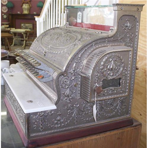 <table width="100%" border="0" cellspacing="0" cellpadding="4"><tr><td><em> </em></td></tr><tr> <td width="100%"> National cash register with exquisite detailing. Register is 17 inches tall, 17 1/4 inches wide, and 16 inches deep. Drawer works. Cash keys are $1 to $6 with cents from 5 to 90, plus a quart, pint, 1/2 pint, and no sale. The back of the cash register also has fancy patterns on it. Looks to be nickel plated. A perfect item to display in your store, home, or game room. Rare and beautiful! You are welcome to peruse our other listings. We will be glad to combine shipping for multiple purchases of small items.