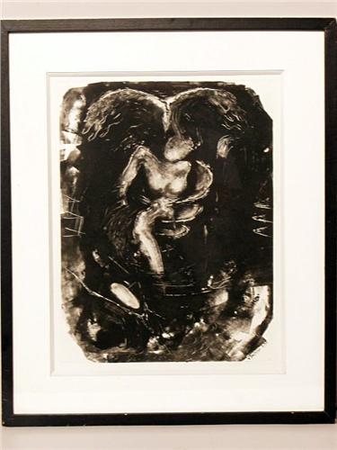 Descripton: By Janice Toulouse Shingwaak. 1994 Etching - Figure with Eagle Hovering.