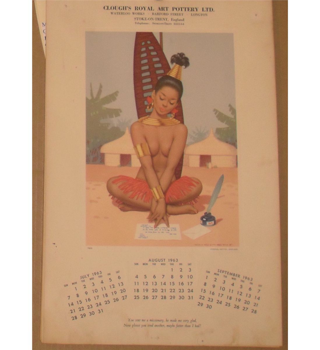 Is she reading your letter? 1963 unframed pin-up girl; you can use it as is, or frame it; lovely bright colours, a impressive old image on yellowing about 14 high x 9 plus inches paper like an African "Native" , far away story fantacy art; great for man cave; drawer, wall, or secret area or gift for ladies' too as tasteful composition is this advertising calendar ; you may consider to combine this one item with others during the next Saturdays January and February AOAV-Attics auctions to save even more; great for your collections or start one, or as a gift !!!