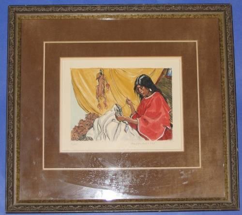 Watercolor by listed American artist Nancy McLaughlin (1932-1985) 5"x7" image, 13.5"x15" framed. Matted. Indian woman sewing. 5lbs. (13-2)