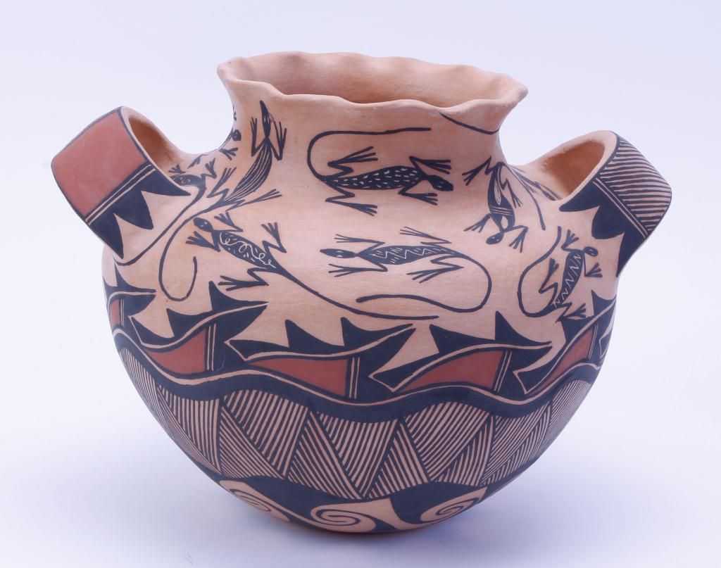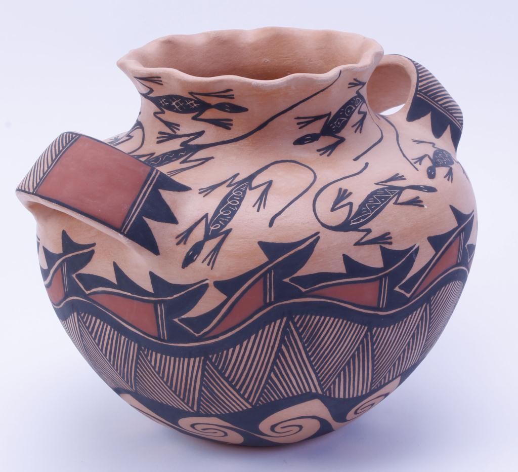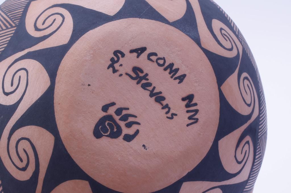 Signed by Sharon "Butterfly" or Turquoise Stevens who is a member of the Bear Clan. Her favorite designs to paint are the turtleback (turtles are believed to bring you long life) and lizard designs (lizards are believed to bring good luck). She signs her pottery S L Stevens followed by a bear paw to denote her Clan origin.