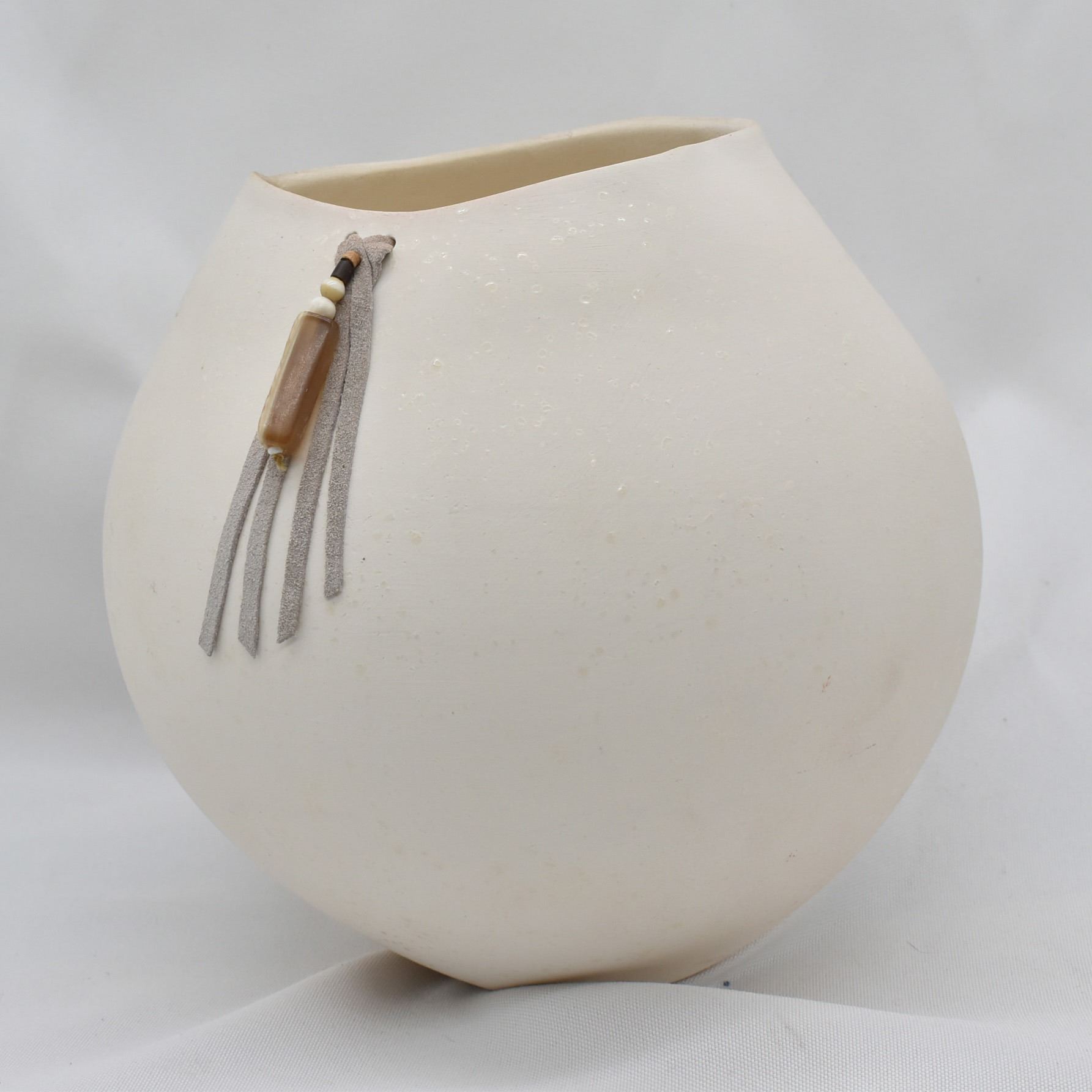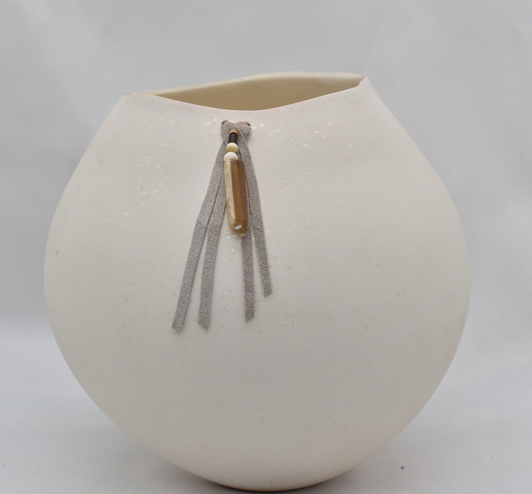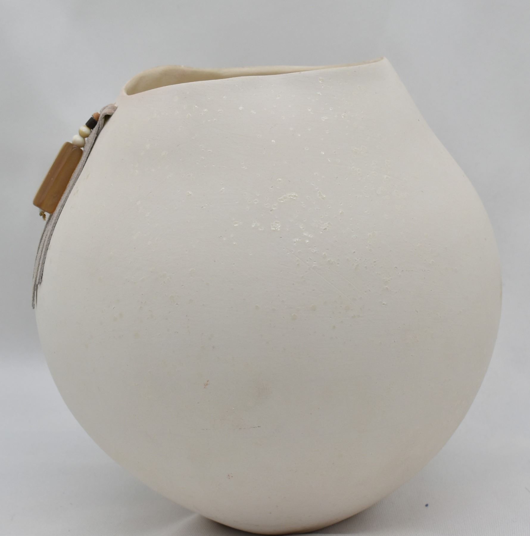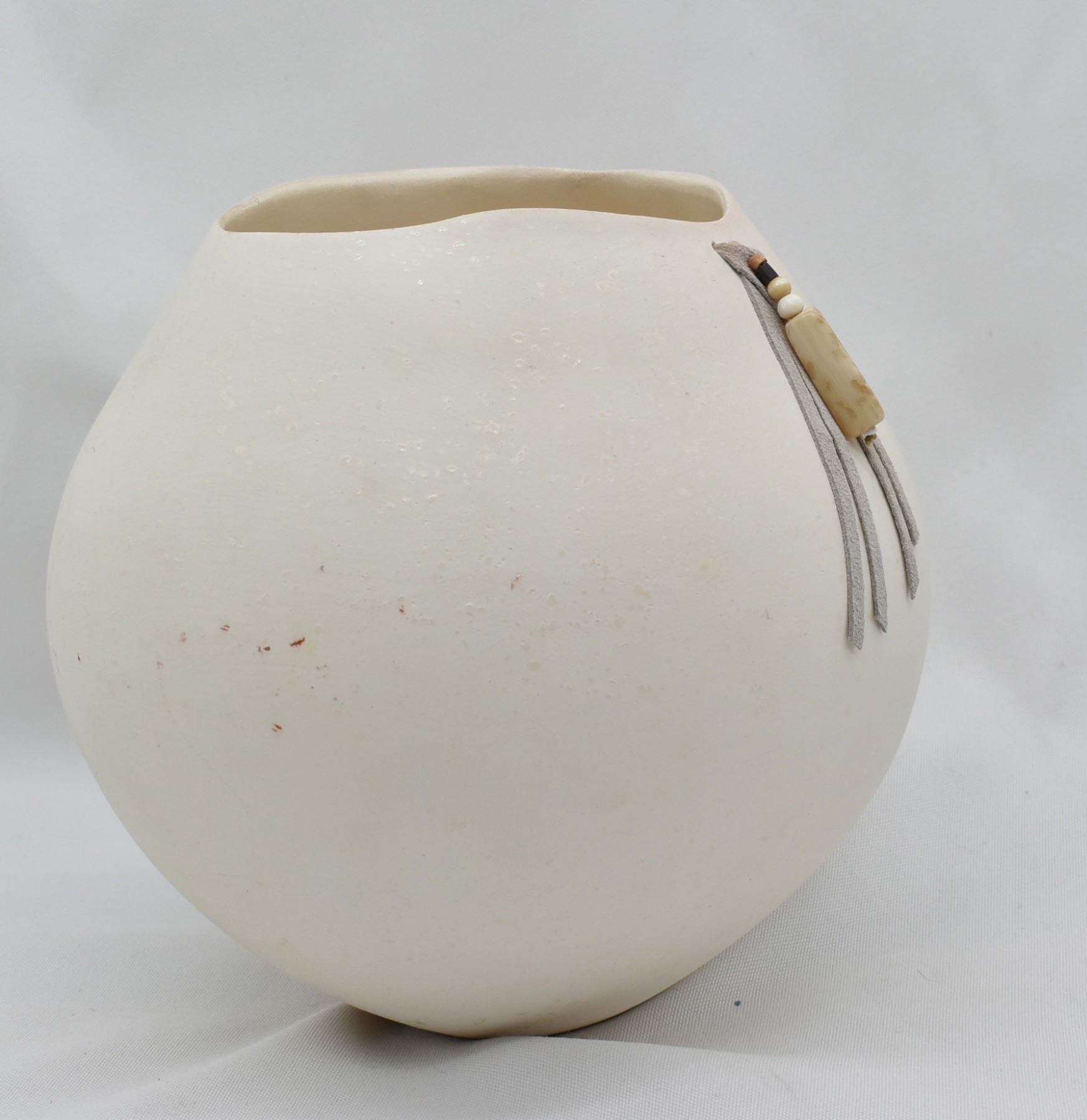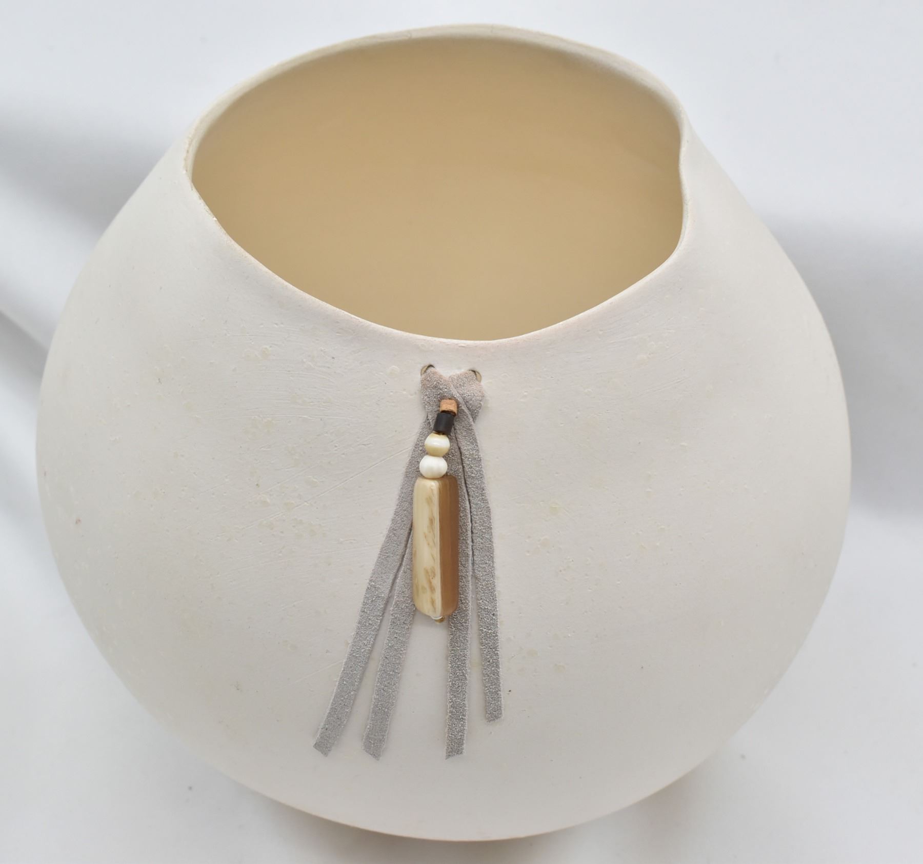 Native American Acoma Micaceous Clay Pottery Bowl by J. Stevens, measures 7'' x 7'', embellished with leather and glass bead dangle, signed on the bottom, freeform rim