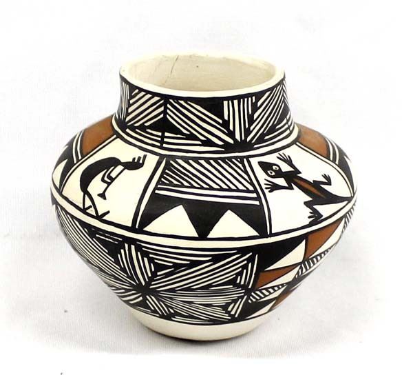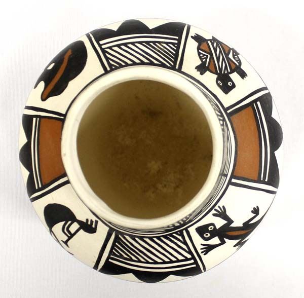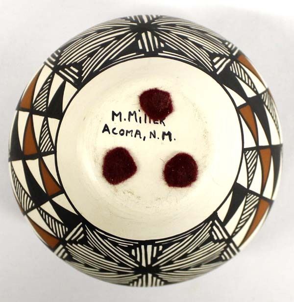 Massey Estate: Native American Acoma Pottery Jar by Marie Miller, signed by the artist and measures 3.75''H x 4.5''D, fine line designs along with a bear, turtle, kokopelli, and lizard