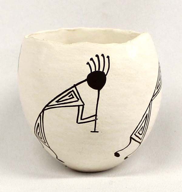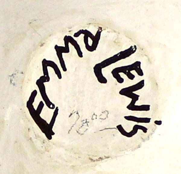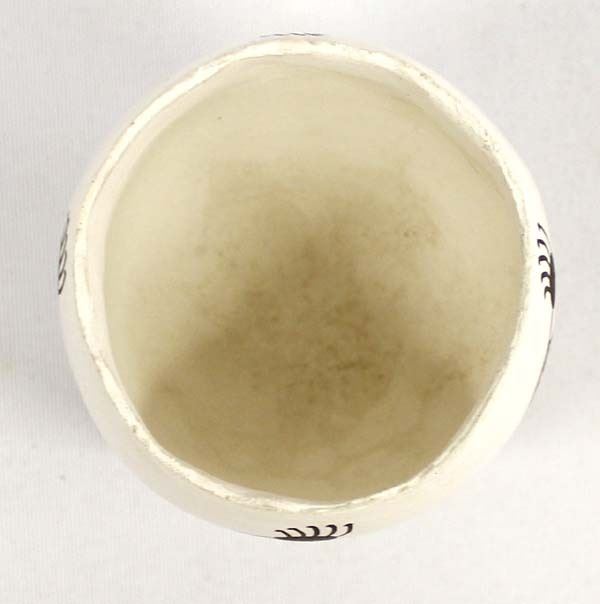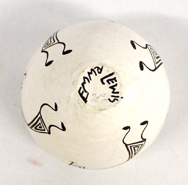 Native American Acoma Pottery by Emma Lewis, measures 2'' x 2.5'' and is signed on the bottom, this jar's shape and rim reminds me of a soft boiled egg whose top has been removed, FYI: ''Emma Lewis Mitchell (1931-2013) came from a family of potters whose mother was the 20th century potter Lucy Lewis of Acoma Pueblo. Emma was born in 1931 at Acoma Pueblo. Her list of awards and honors are too long to include here. She has conducted numerous demonstrations and workshops too. She had been actively making pottery since 1952 and often used Mimbres and Anasazi Revival designs.''
