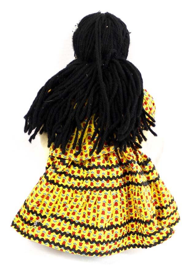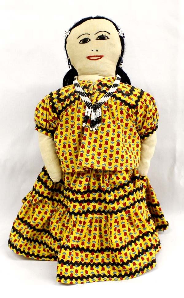 Native American Apache Doll, measures 6'' x 13.5'', hand sewn facial features, beaded hair adornments, earrings, and necklace, wearing traditional Apache top and skirt embellished with ric rac