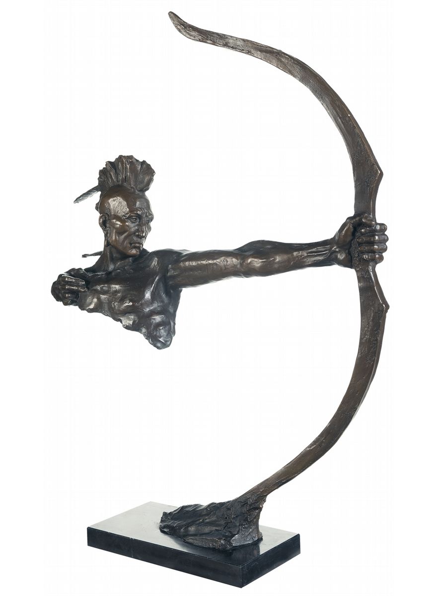 This is a stunning Art Deco stylized bronze of a male archer from an Eastern Indian Tribe. His outstretched arm is holding a bow that rests on a rectangular marble plinth. The Indian has a stern look on his face as he fires a fatal shot to his prey. Has Mohawk styled hair. Signed on the bronze base "chiparus". Measures 33 1/2 inches tall x 24 inches long x 6 1/2 inches wide. Weighs 23 pounds.