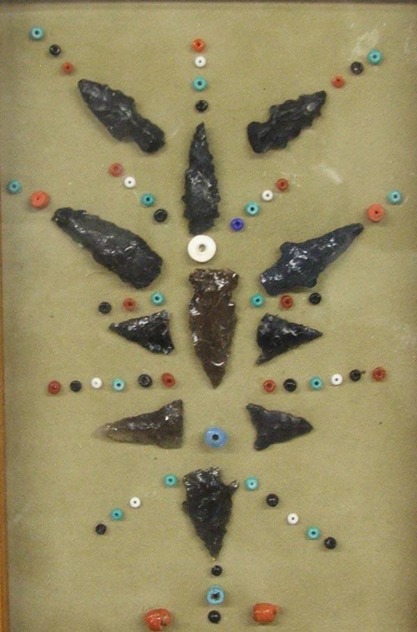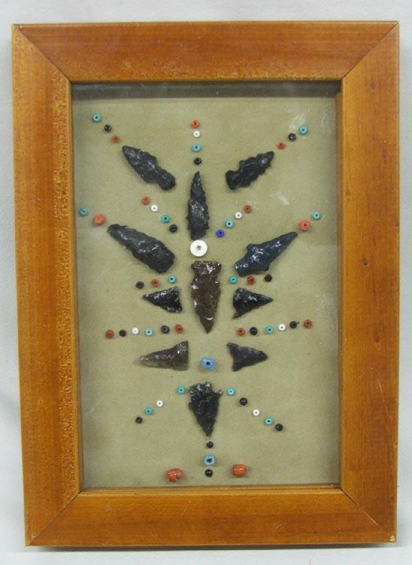 Native American Framed Arizona Arrowhead Collection , visual measures approx. 5.5 x 3.5''. Black obsidian Arrowheads, all genuine, with misc. beads & adornments. Buyers Pay Actual Shipping and Handling Charges(see terms and conditions for more information)
