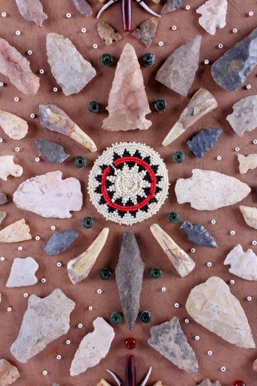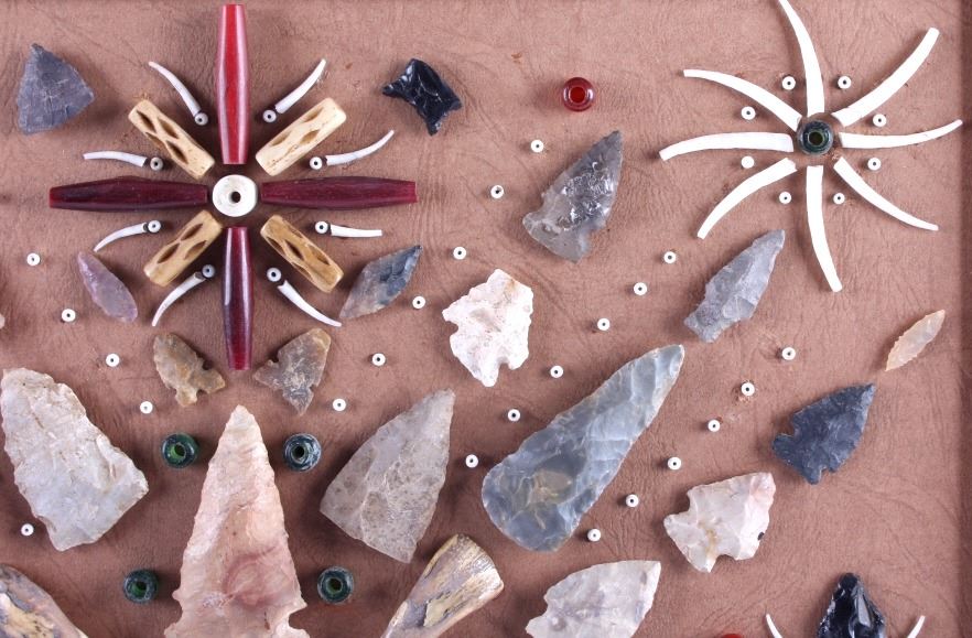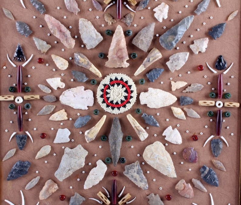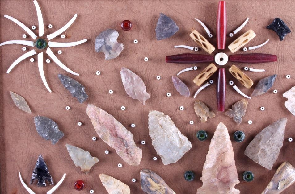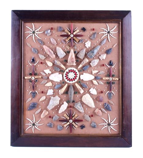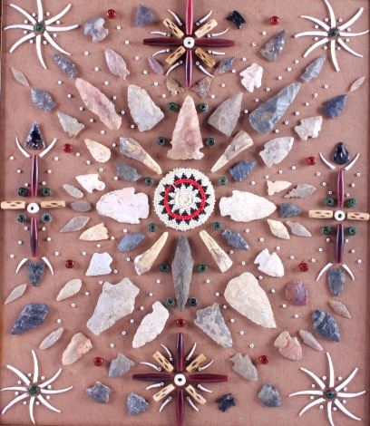 This is a Native American Indian arrowhead artifact collection. The genuine arrowheads came from the private collection of a retired surveyor who worked in Montana, Idaho, Wyoming and the Dakotas from the 1940's to the mid 1970's. The artifacts are beautifully displayed with trade beads, buffalo teeth, bone beads and dentalia shells. The antique walnut hardwood frame showcases the arrowhead collection wonderfully. The Native American arrowhead display is in good condition. The frame measures 19" x 21.5".