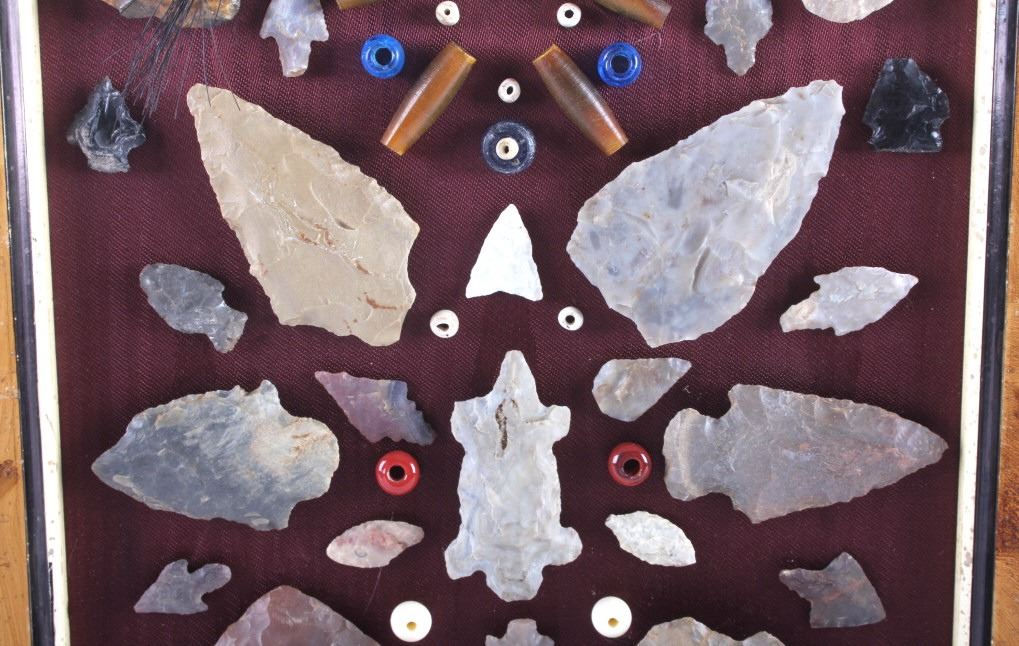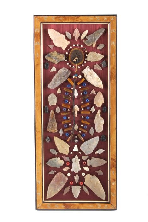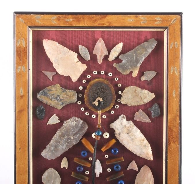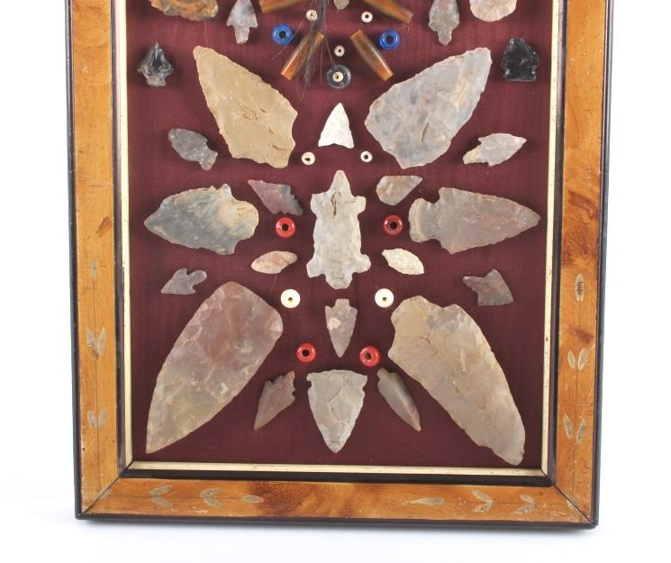 This is a Native American Indian arrowhead artifact collection. The genuine arrowheads came from the private collection of a retired surveyor who worked in Montana, Idaho, Wyoming and the Dakotas from the 1940's to the mid 1970's. The artifacts are beautifully displayed with trade beads, buffalo bone beads and horn beads. The antique wooden spoon carved frame showcases the arrowhead collection wonderfully. The Native American arrowhead display is in good condition. The frame measures 9.5" x 22.25".