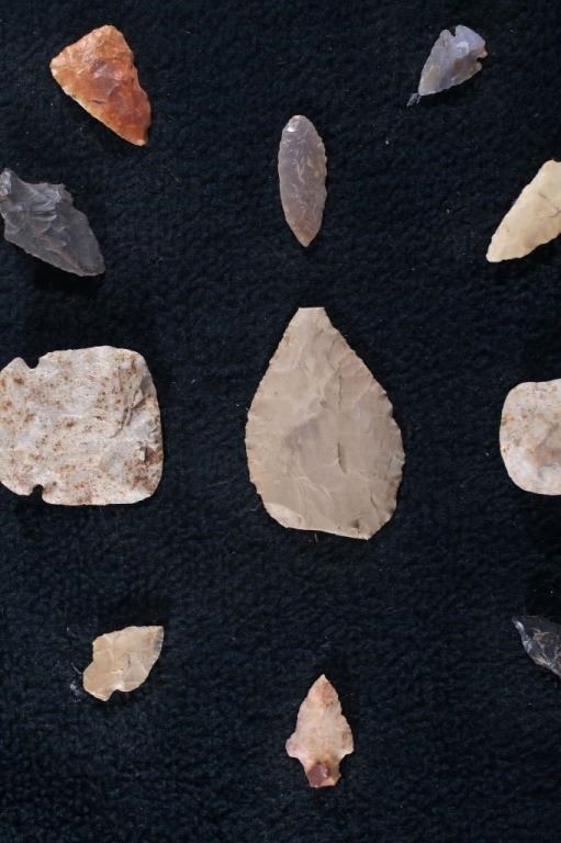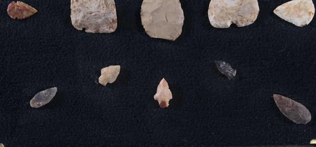 Included in this lot we have a a Native American arrowhead and artifact collection. The collection consists of 17 unique artifacts in total and arranged facing toward the center. The display shows nine arrow heads, four spear heads, and four scrapers/ tool heads. The collection is set onto a black felt with a brass corner covers. The collection is set into a custom rustic wood frame and shows good condition overall with some wear due to age. The frame measures 21 3/4" tall by 25 3/4" wide with the largest of the artifacts measuring 3 1/2" tall by 2 1/2" wide.