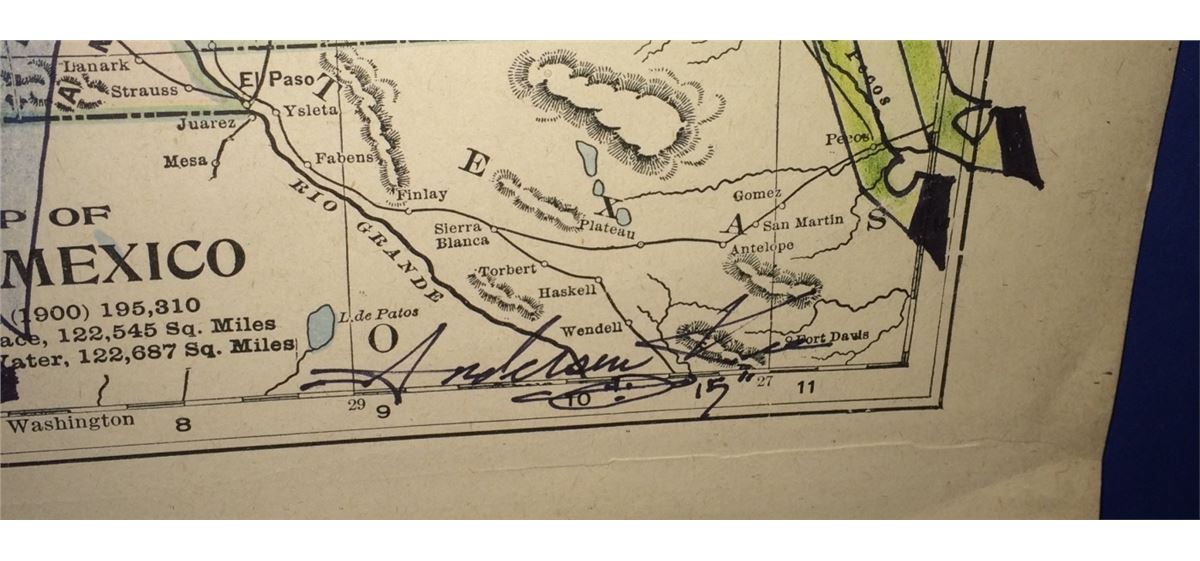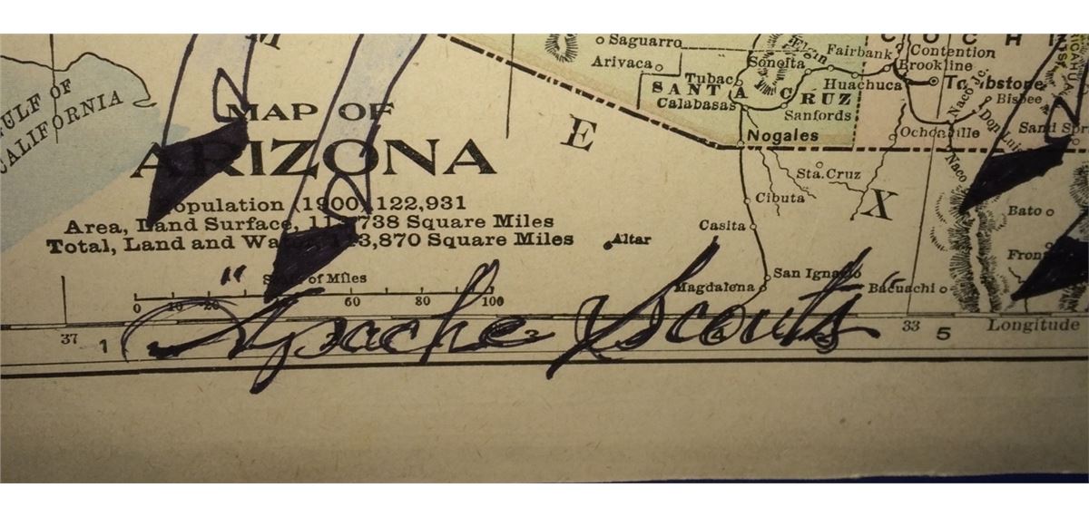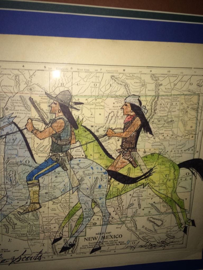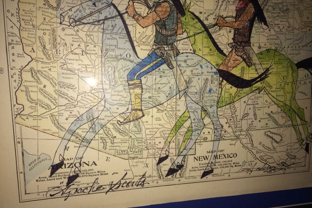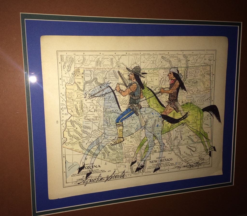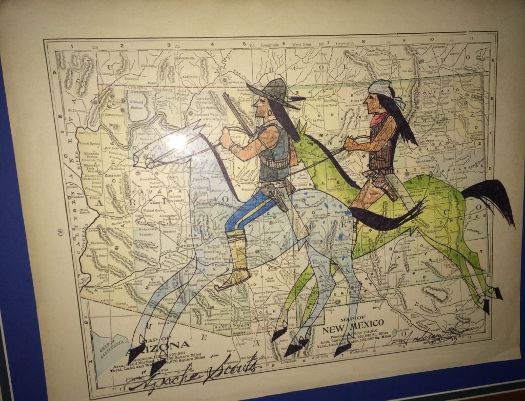 This original art by Anderson Kee (Navajo) is titled “Apache Scouts” and is on a map of Arizona and New Mexico with a date of 1900 on it. Nicely framed, double matted and under glass. Measures 25.5” wide X 22.5” tall including frame. Shipping: There will be a $10 handling / packaging fee for shipping this lot. The actual cost of postage will be added on top of that.