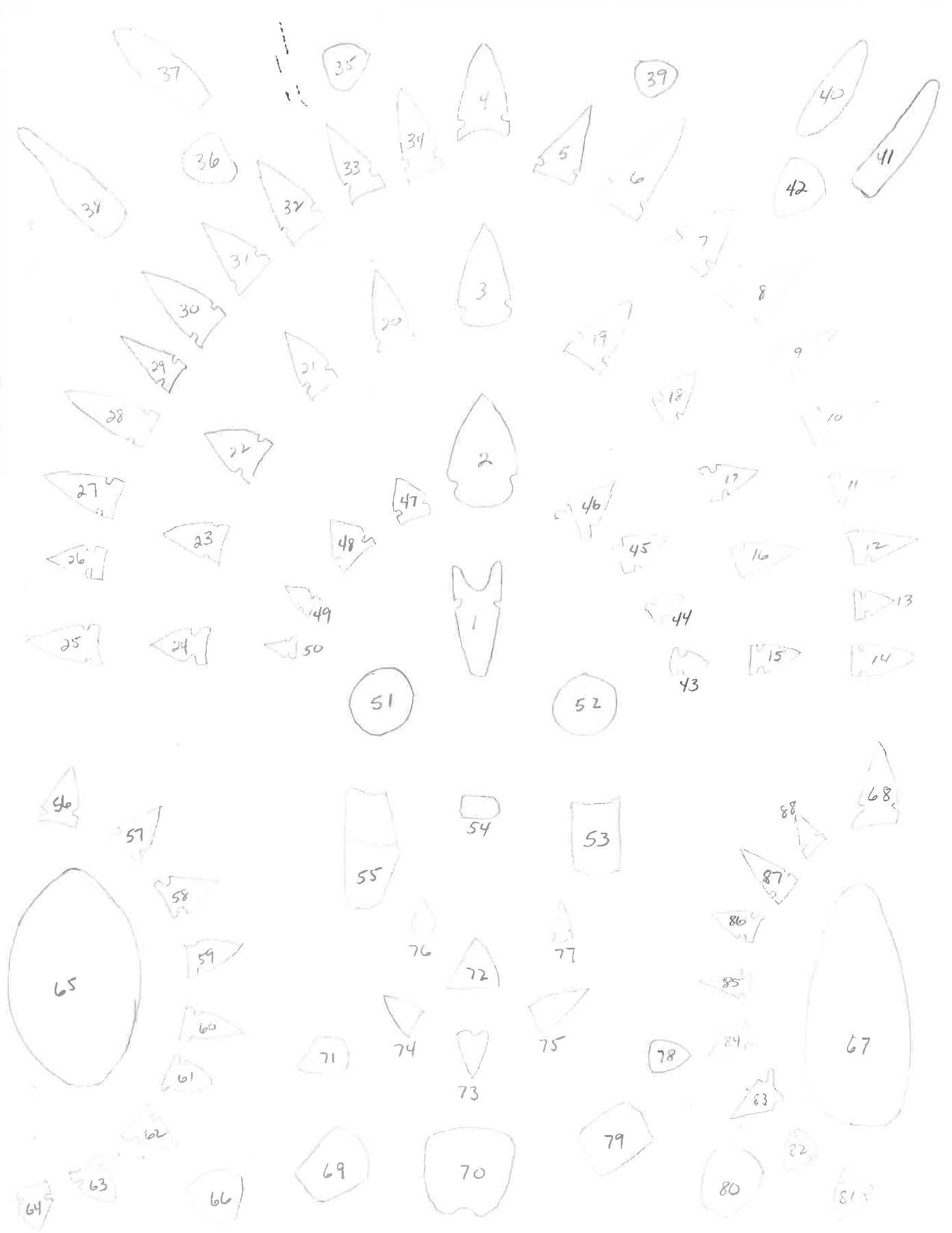 Native American Artifact Frame: 88 pcs., assorted knives, points and scrapers, found at Strickland Trap, Vaughn, MT, 1969, 17" x 21". Comes with authenticity papers showing where each piece was found.