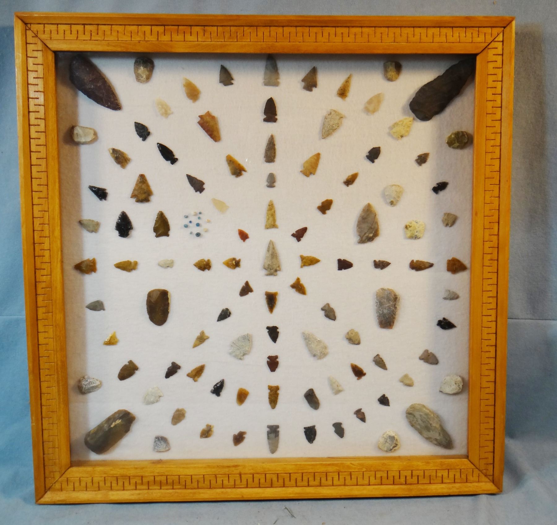 Native American Artifact Frame: 99 pcs., assorted knives, points and scrapers, Augusta, Smith River, Gore Hill, Sun River, 21" x 21". Comes with authenticity papers showing where each piece was found.