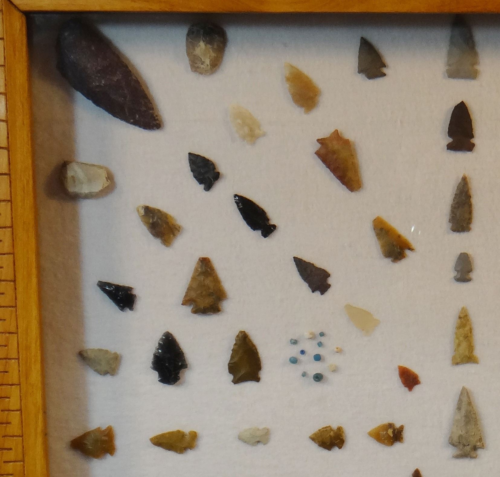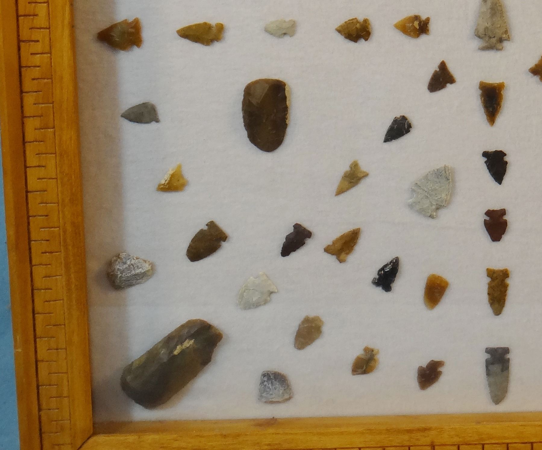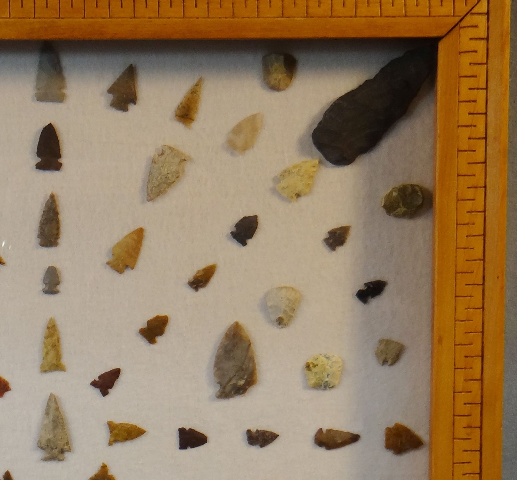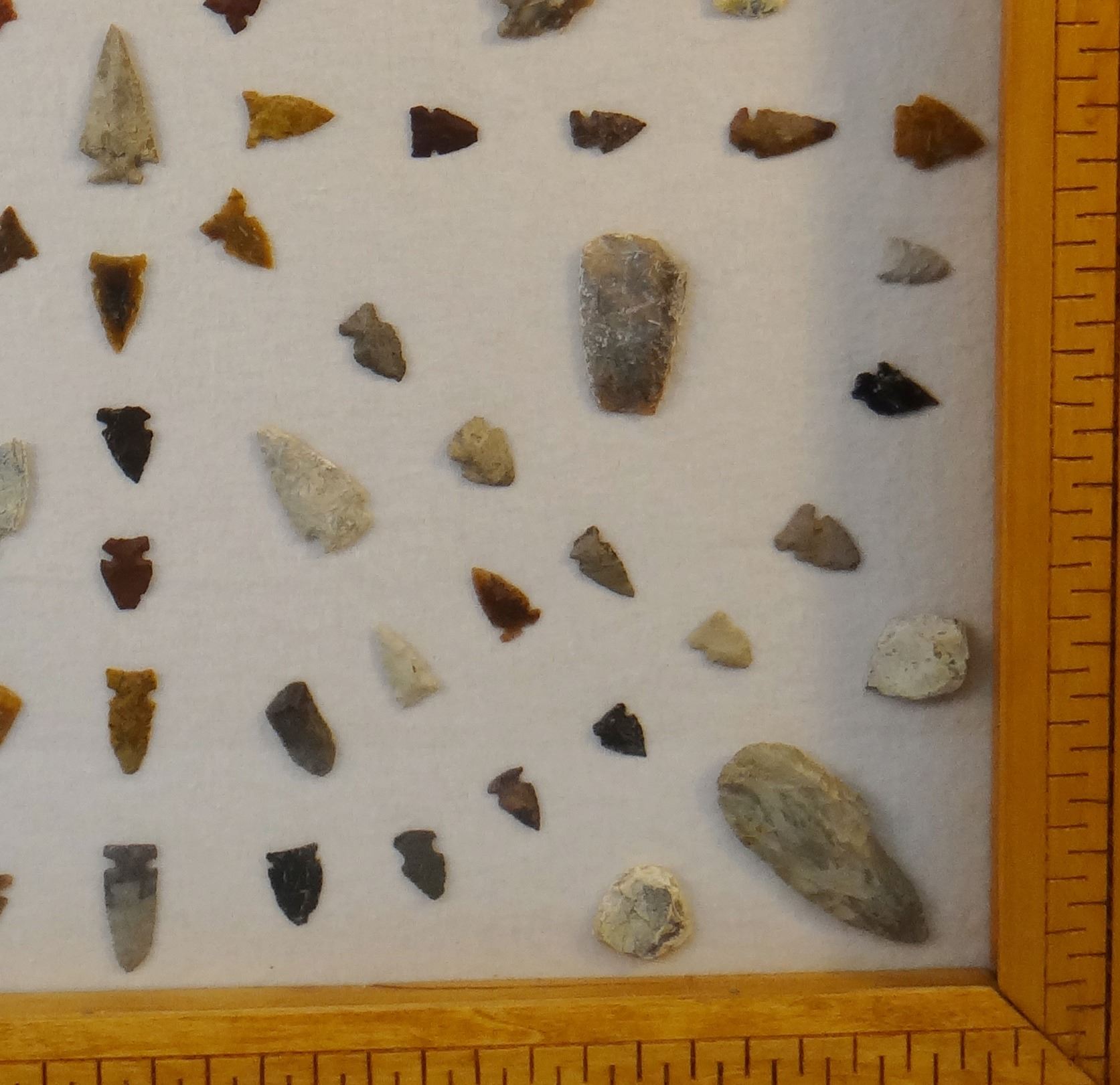 Native American Artifact Frame: 99 pcs., assorted knives, points and scrapers, Augusta, Smith River,