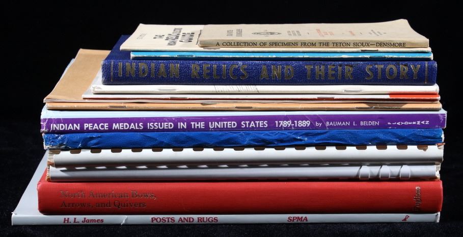 Available in this lot we have a collection of Native American Indian artifact and relic identification guide books. The collection consists of fourteen guide books on recognizing and identifying Native American artifacts and relics. The titles are; Indian Notes and Monographs, Indian Relics and Their Story, Kutenai Pipes, The Indian Relic Collectors Guide, American Indian Art Before 1850, The Technique of Porcupine Quill Decoration Among The Indians of North America, Indian Trade Goods, Indian Peace Medals Issued in the United States, Navajo Rugs -Past, Present & Future-, Posts and Rugs, North American 'Bows, Arrows, and Quivers', Guide to the identification of certain American Indian Projectile points No.1 & 2, and finally Secrist's Simplified Identification Guide. The books where written by a wide array of authors and originate from the mid 20th century. The guide books show good condition overall with some showing some minor wear due to age. The largest of the books measures 12" tall by 9" wide.