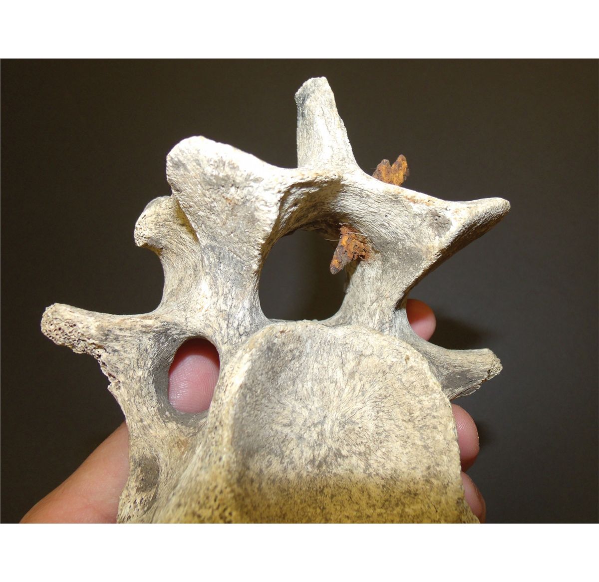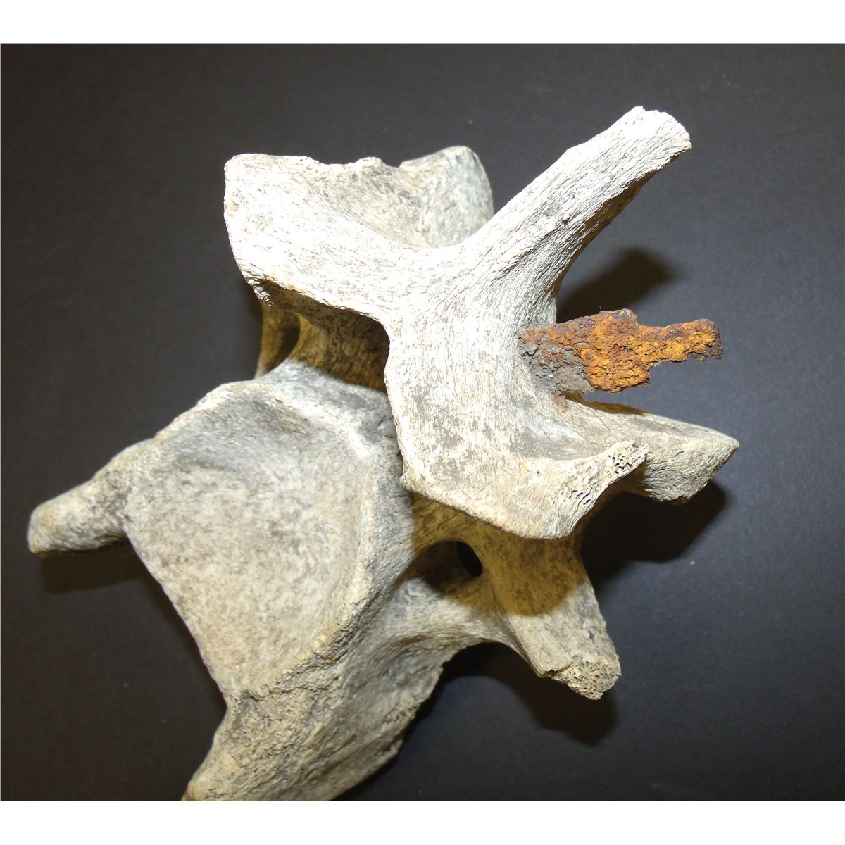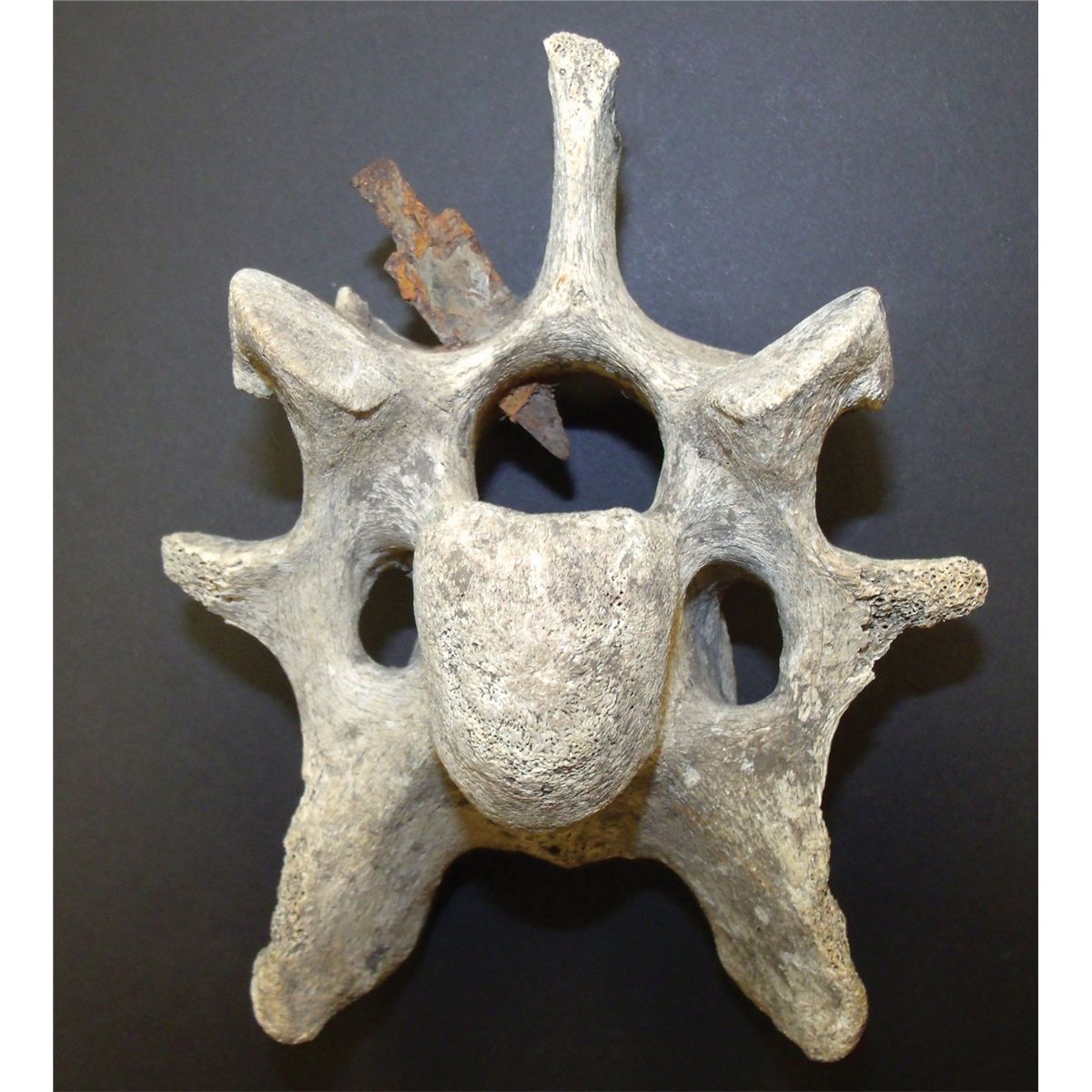 Mammalian neck vertebrae with iron trade arrowhead embedded, bone has been evaluated by a veterinarian and deemed to be from a large quadruped, most likely elk. The embedded arrowhead is a 200 to 400 year old trade item. The exact location of discovery is unknown, but species and arrowhead type suggest Great Plains origin. Bone is 6 inches wide, and arrowhead is approximately 2 inches long. This is very rare item, with few authentic examples known to exist.
