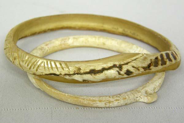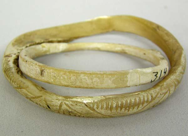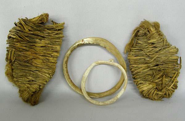 Native American Artifacts, 2 Shell Bracelets (one carved) and Moccasin Remnants. Largest bracelet measures approx 9'' inside circumference, moccasins measure approx. 5''Lx3''W. Buyers Pay Actual Shipping and Handling Charges(see terms and conditions for more information).