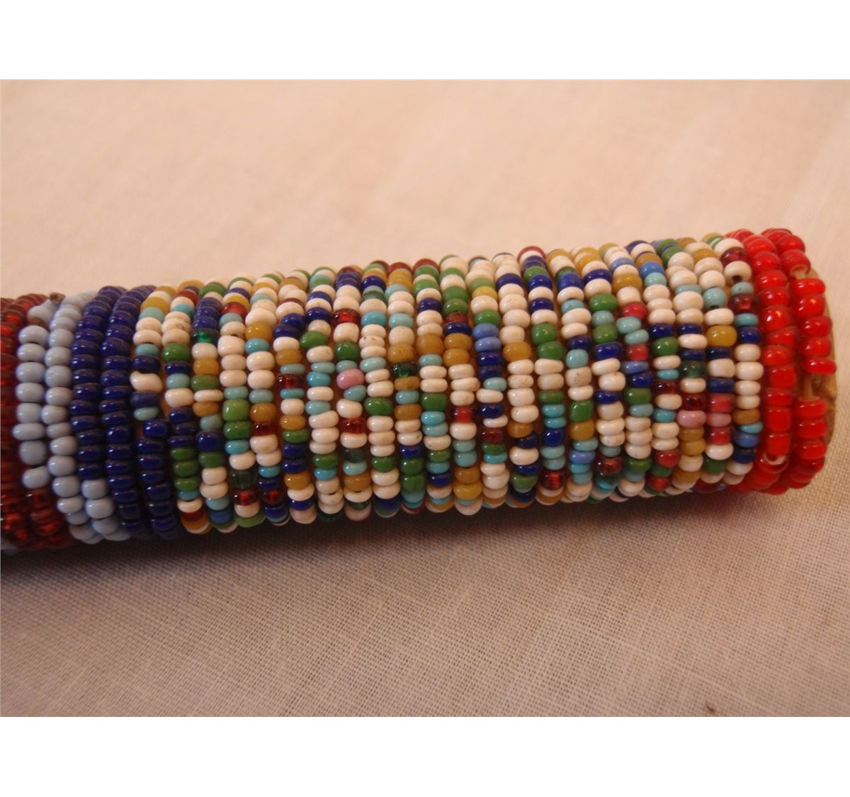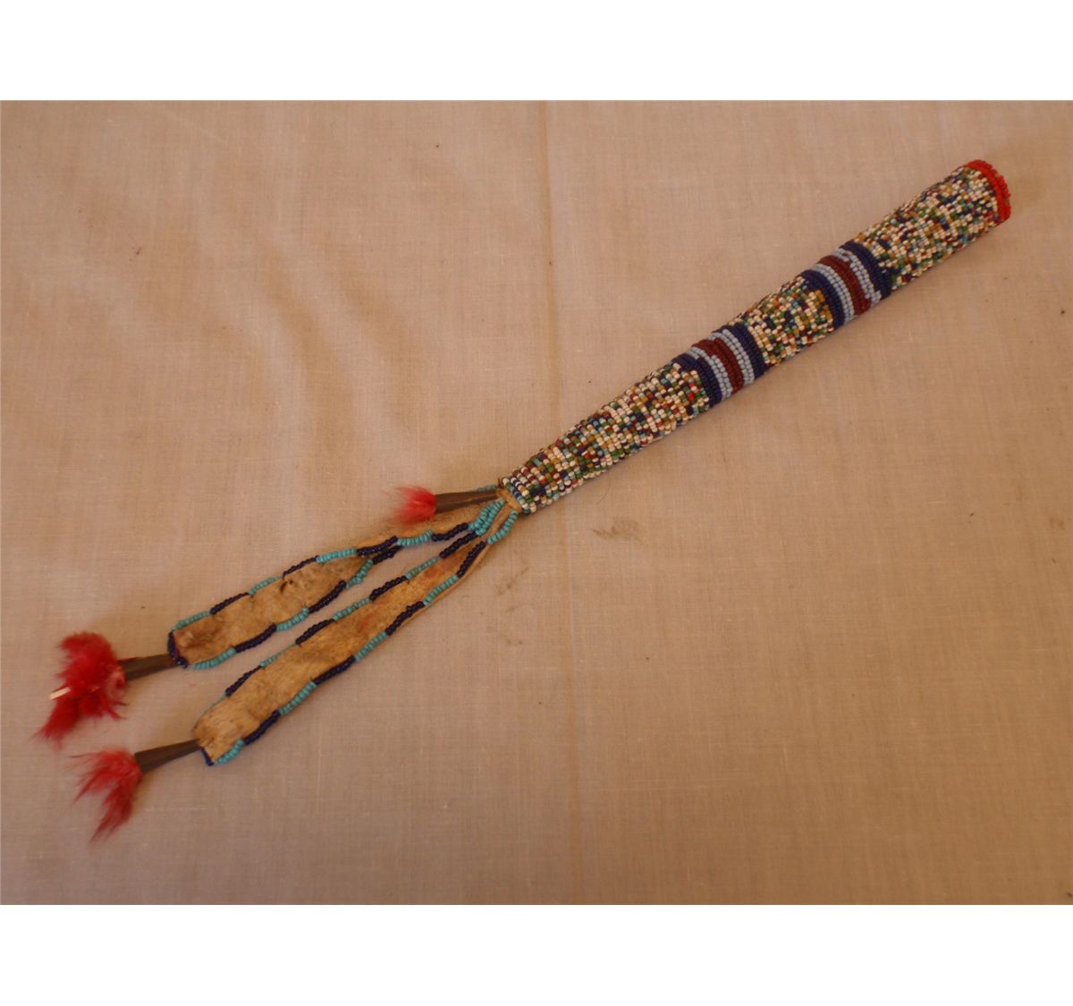 Natural hide parfleche case adorned with multicolored beads tightly strung on sinew. Metal cones attached to deer skin. Missing lid and tool. 12" total length, room for tool is 7" Shipping on this lot: $10.00. Additional Shipping Charges for Lots sent outside of the U.S