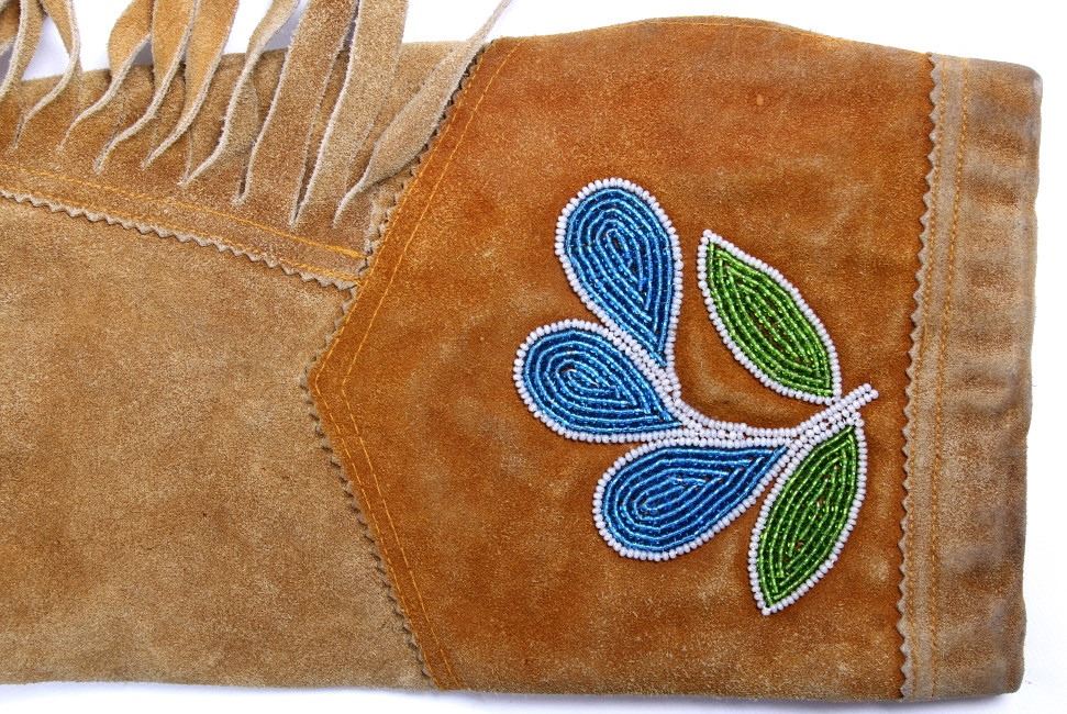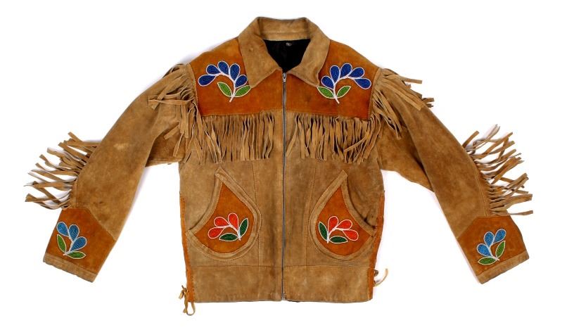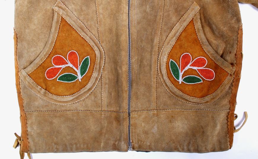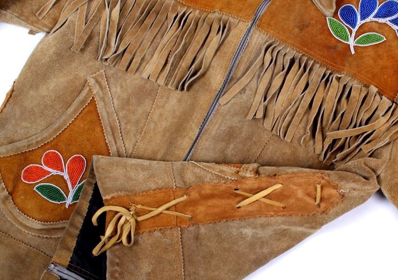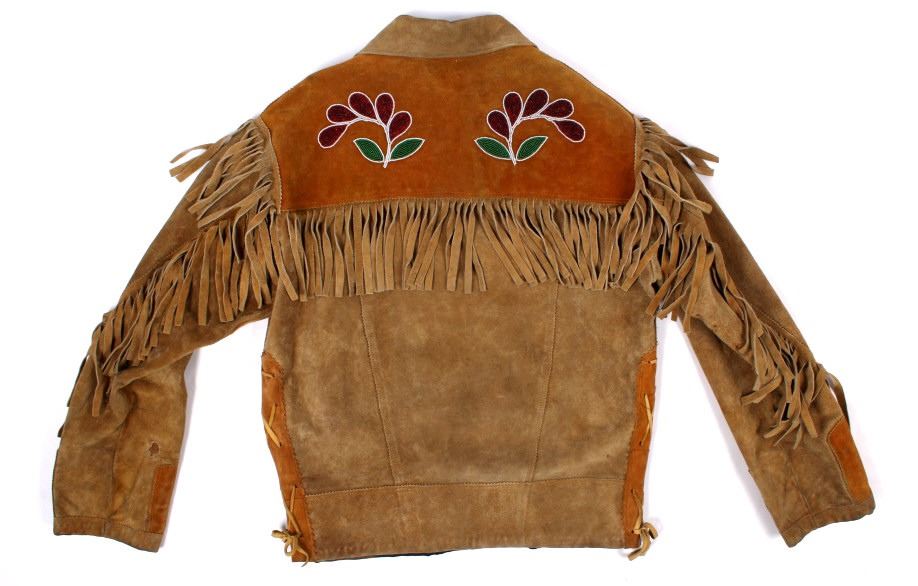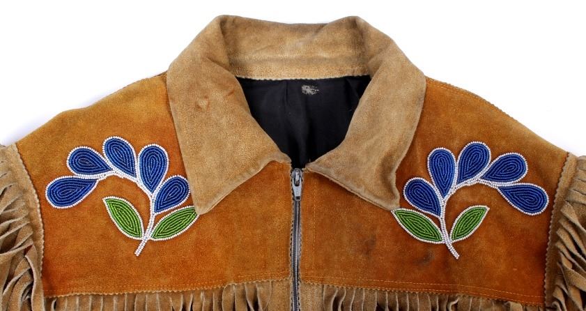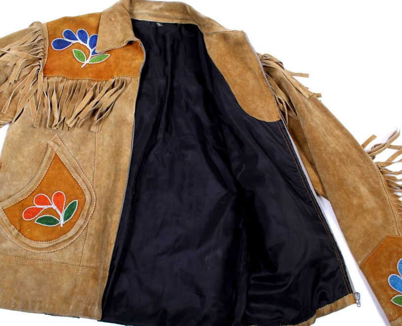 You are bidding on an original Native American buckskin beaded jacket. The jacket features a black satin lining, contrasting colors of buckskin, fringe on the sleeves as well as across the back and chest, and stylized floral motif beadwork. The designs are worked directly onto the buckskin without a background. Bead colors included are Light Green, Dark Green, Red, Orange, Pony Trader/ Powder Blue, and Navy Blue. The jacket does have a repaired hole on the left sleeve, but is in otherwise very good used condition. The jacket has no indication of size; its dimensions are 18.5" neck; 22" shoulder to shoulder; 42" chest; 28" at the waist; 25.5; Shoulder to bottom hem; and 24.5" sleeve.