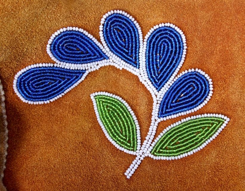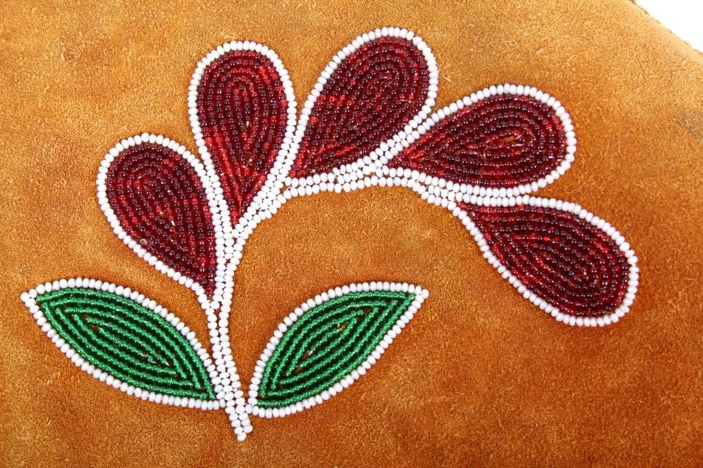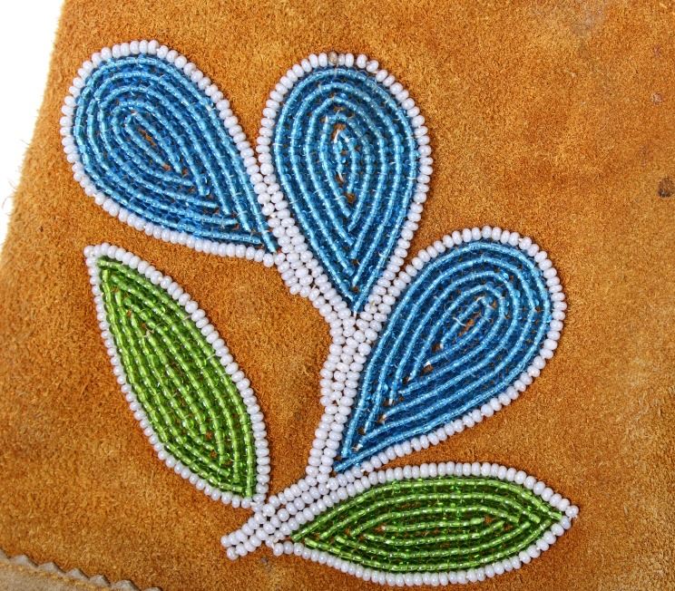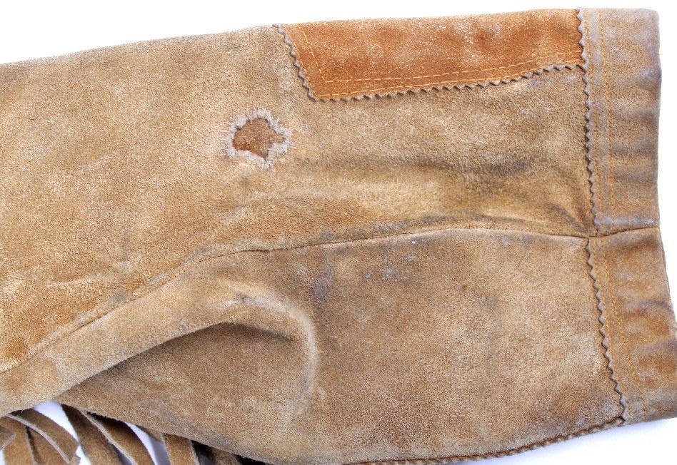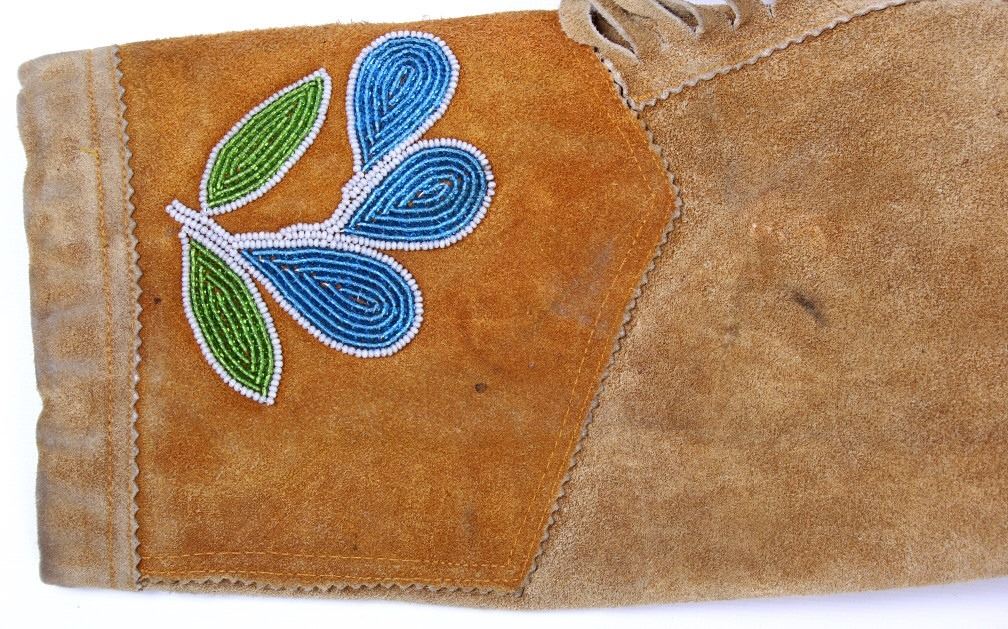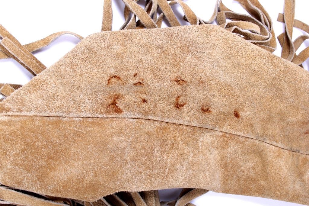 You are bidding on an original Native American buckskin beaded jacket. The jacket features a black satin lining, contrasting colors of buckskin, fringe on the sleeves as well as across the back and chest, and stylized floral motif beadwork. The designs are worked directly onto the buckskin without a background. Bead colors included are Light Green, Dark Green, Red, Orange, Pony Trader/ Powder Blue, and Navy Blue. The jacket does have a repaired hole on the left sleeve, but is in otherwise very good used condition. The jacket has no indication of size; its dimensions are 18.5" neck; 22" shoulder to shoulder; 42" chest; 28" at the waist; 25.5; Shoulder to bottom hem; and 24.5" sleeve.