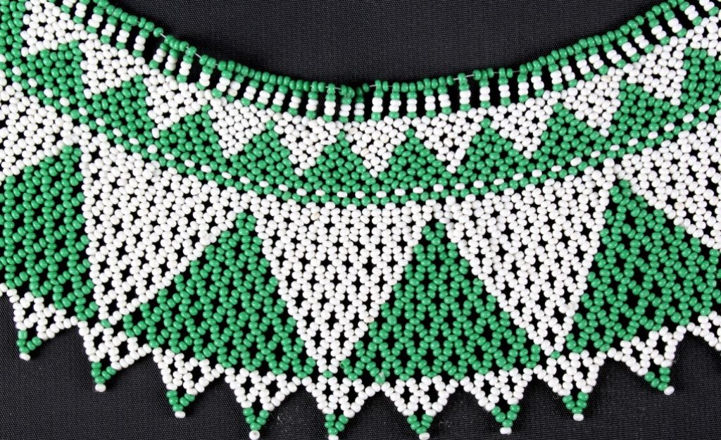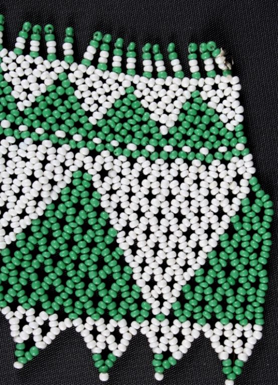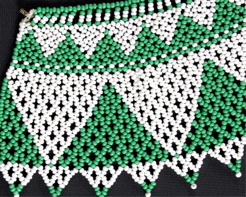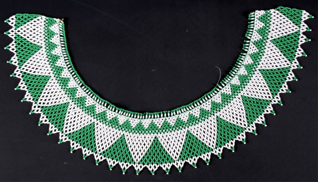 This lot features a Native American beaded collar. This is a handmade piece made from glass beads in the mid 1900's as a ceremonial accessory. One string is broken but no beads appear to be missing. The collar measures 4"x 24".