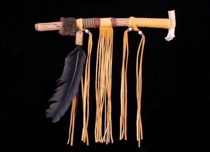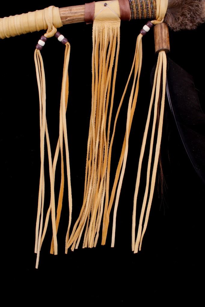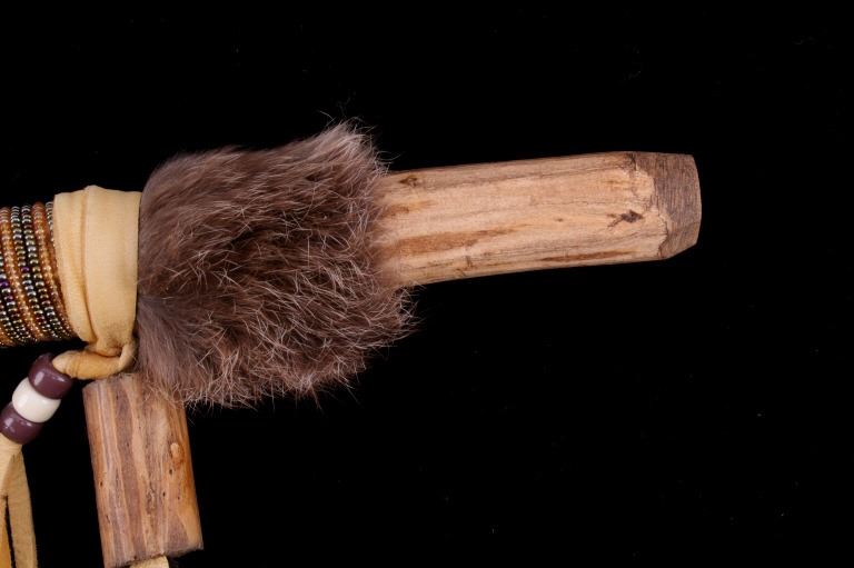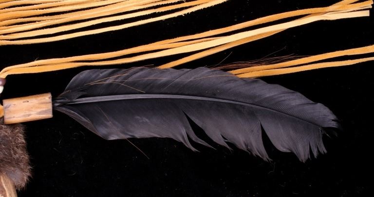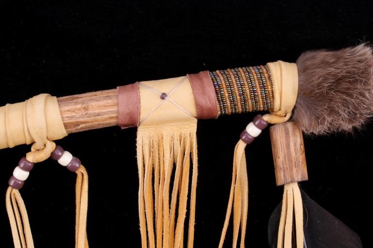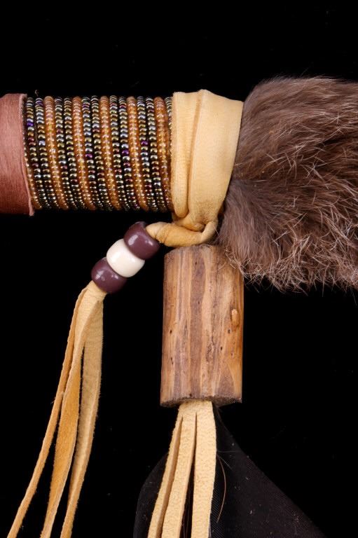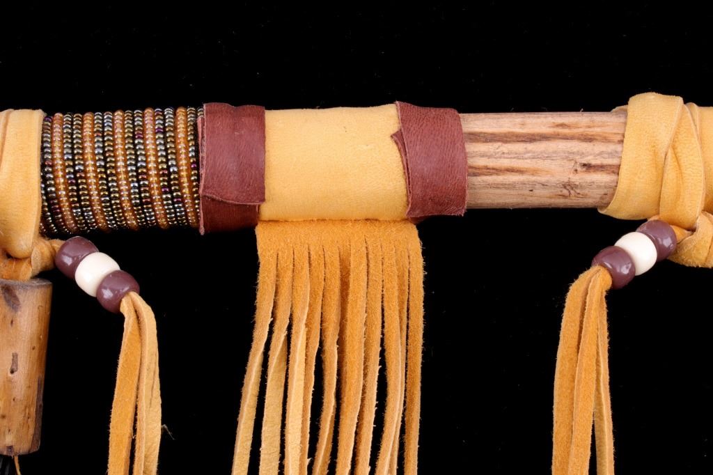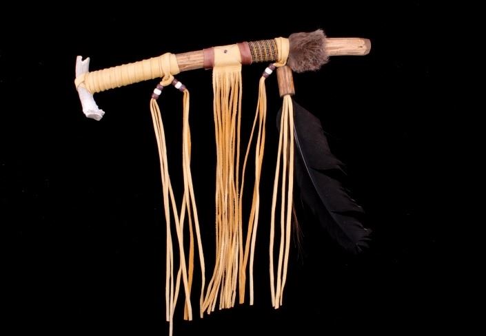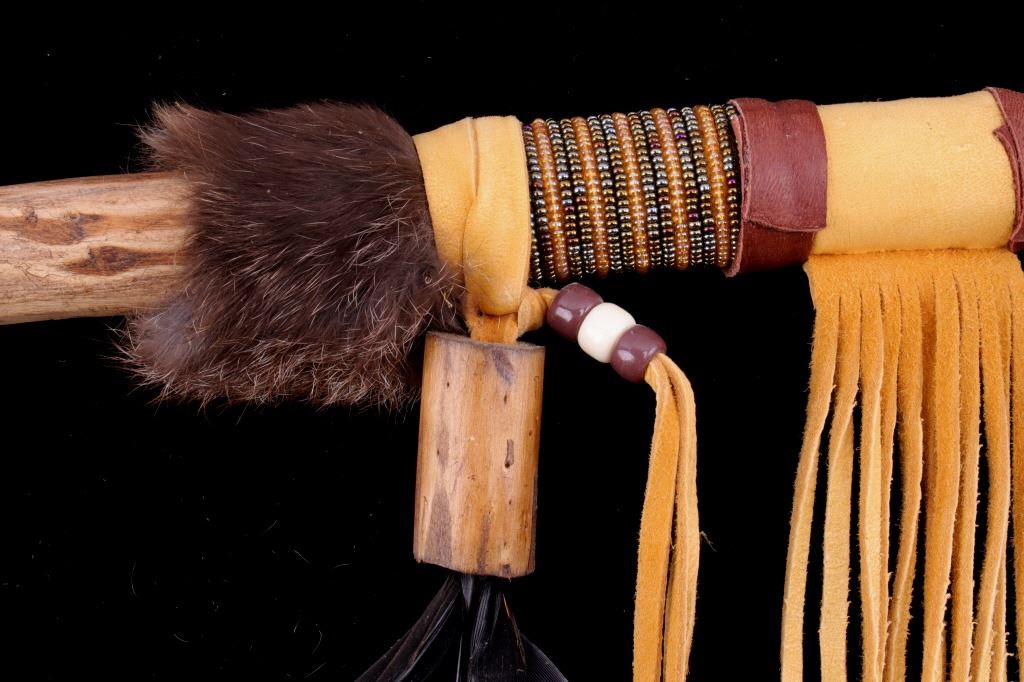 Included in this lot is a Native American beaded fur and bone talking stick. This stick features a wooden stick with dyed leather, fur, glass trade beads, and a feather. The top of the stick is a piece of bone that is held on by dyed leather. The leather is wrapped around the top of the stick and features tassels with a few beads on them. There are rows of yellow and grey translucent beads towards the bottom of the stick. Hanging off the bottom of the stick is a large black feather. At the bottom of the stick is a small collection of fur. This stick is a contemporary piece. The piece is in good condition, showing no signs of damage. The stick measures 15" long.