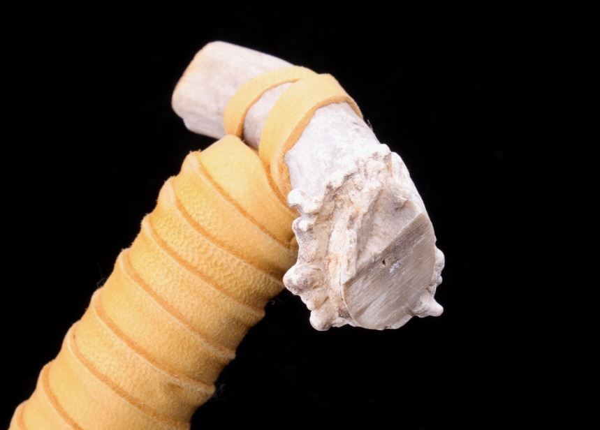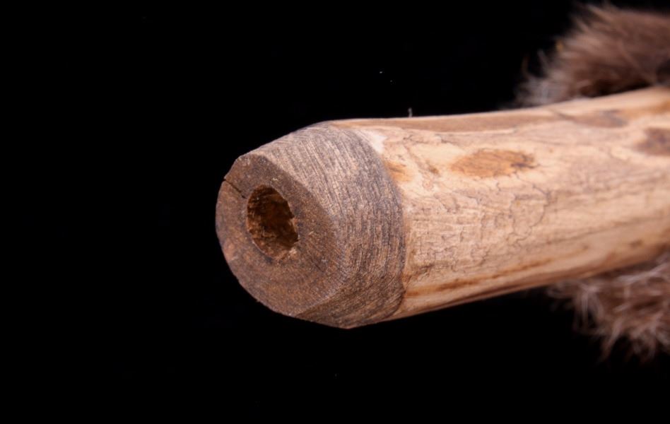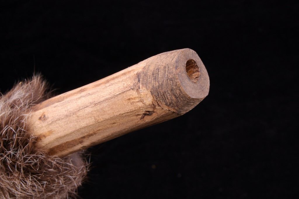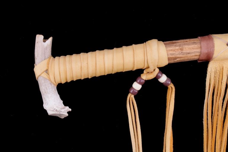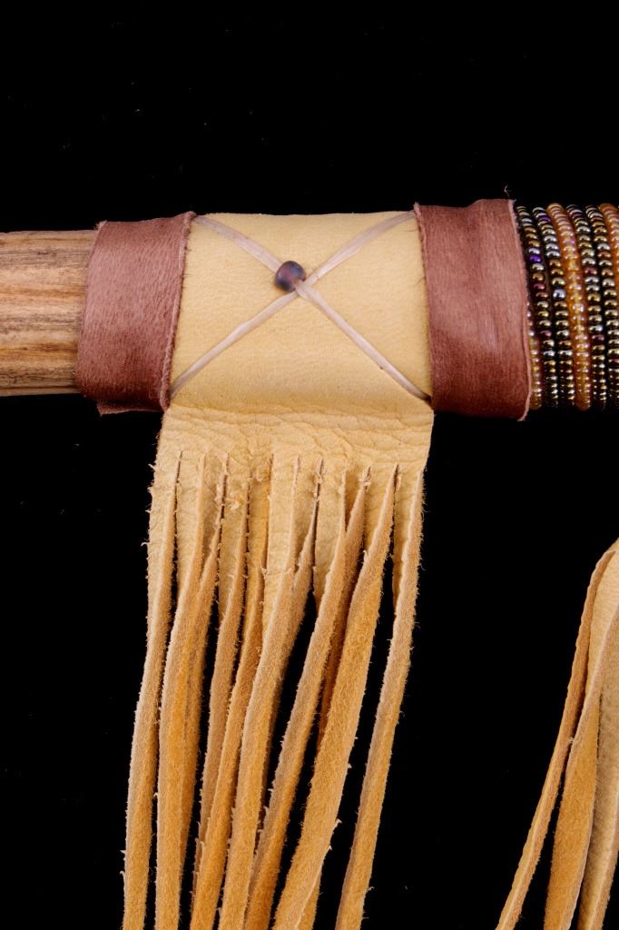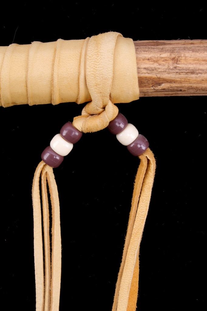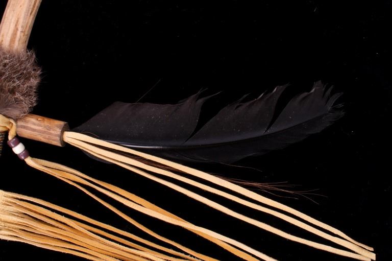 Included in this lot is a Native American beaded fur and bone talking stick. This stick features a wooden stick with dyed leather, fur, glass trade beads, and a feather. The top of the stick is a piece of bone that is held on by dyed leather. The leather is wrapped around the top of the stick and features tassels with a few beads on them. There are rows of yellow and grey translucent beads towards the bottom of the stick. Hanging off the bottom of the stick is a large black feather. At the bottom of the stick is a small collection of fur. This stick is a contemporary piece. The piece is in good condition, showing no signs of damage. The stick measures 15" long.