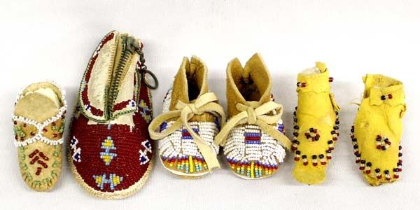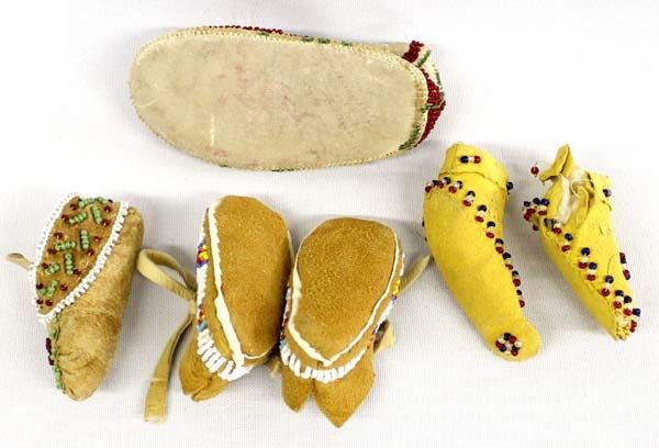 Native American Beaded Leather Miniature Moccasins, largest measures 4'' x 2''