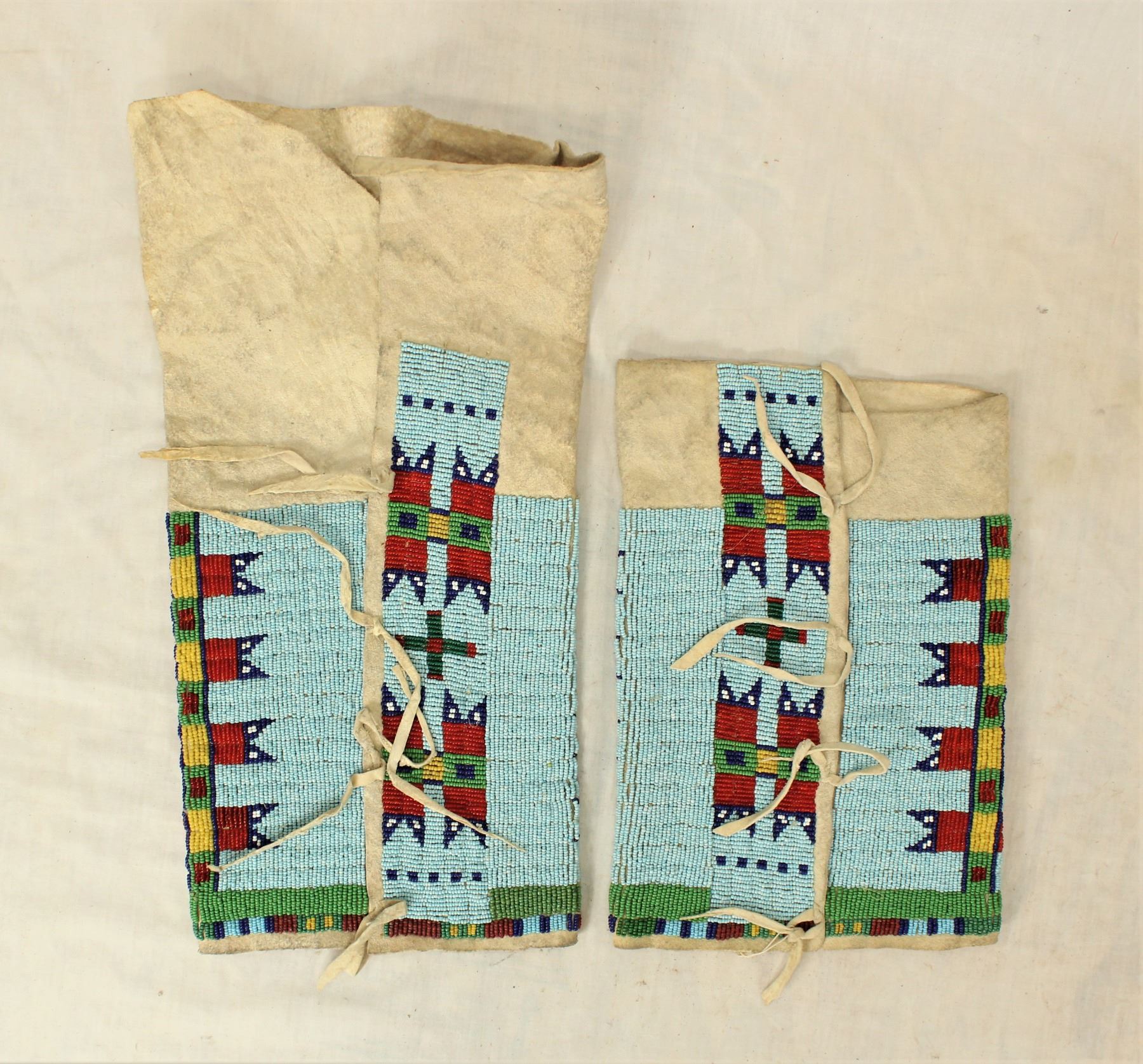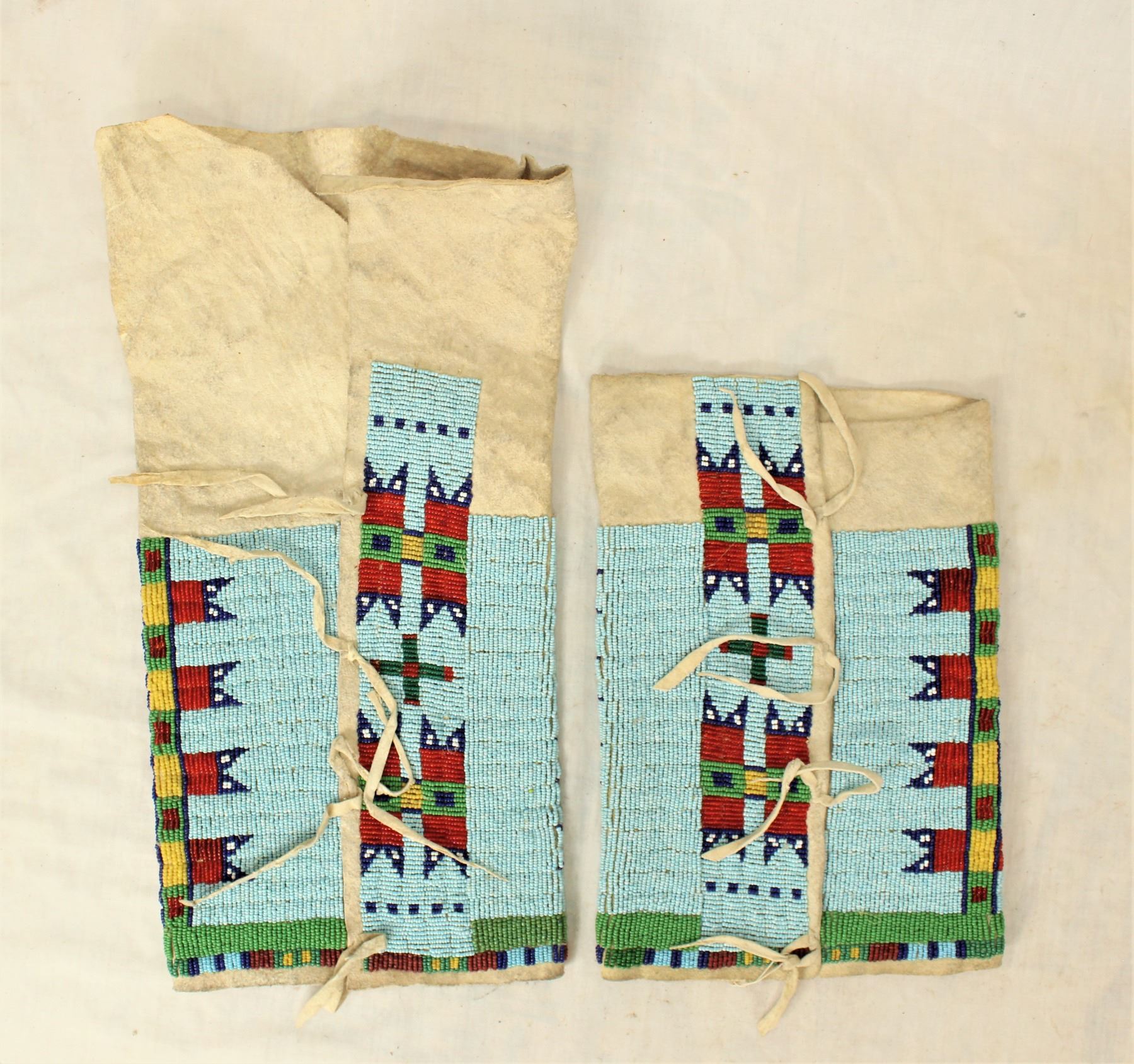 Super nice pair of 1890's leggings, fully beaded in geometric pattern on robin egg blue background.