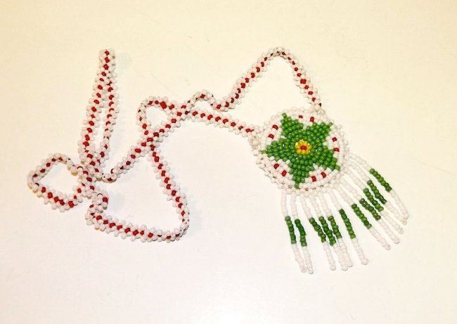 For your consideration is this lovely vintage Native American Plain Indians beaded medallion necklace. The necklace features a traditional woven beaded star design and a beautiful color scheme of white, green, and red. Measure about 22 total length excluding the medallion pendant. The medallion pendant measures about 2" in diameter. Free shipping within the US.