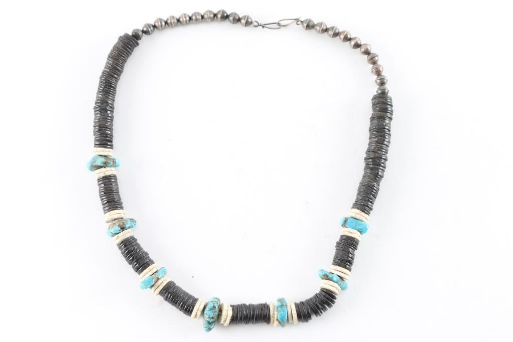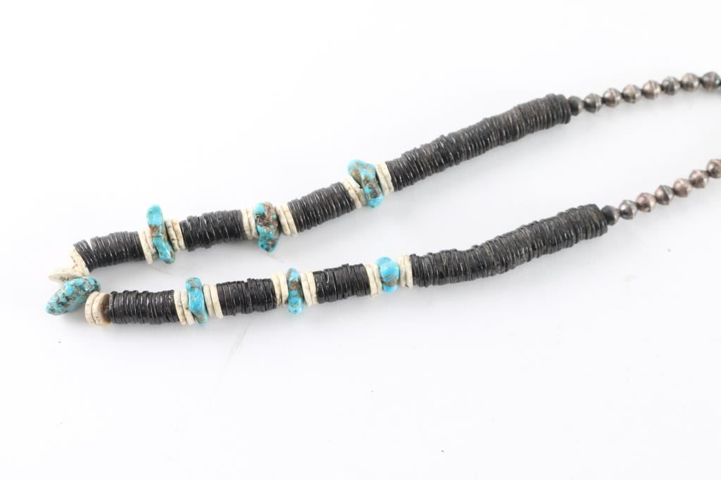 Brown Dish Beads Intermixed With Shell Dish Beads With Turquoise Nuggets In Between With Sterling Beads Near The Clasp.