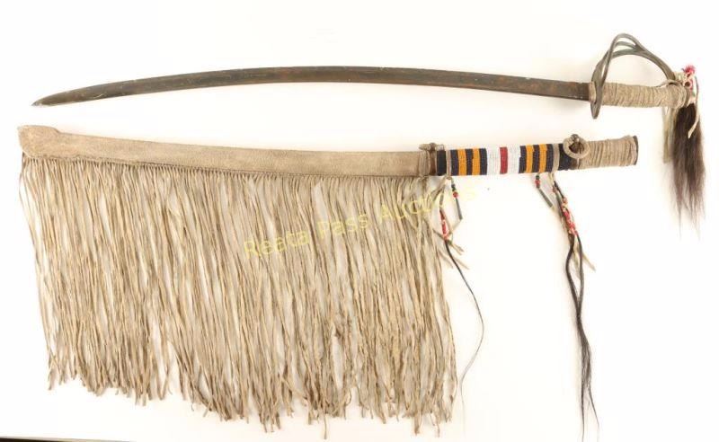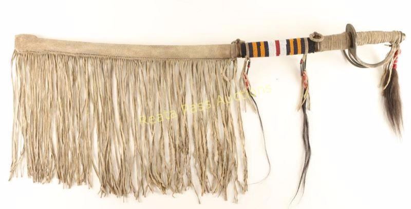 Measures 40" overall with a 34" blade. Intricate bead work, horsehair tassles, and leather fringe sheath from a noted Texas collection.