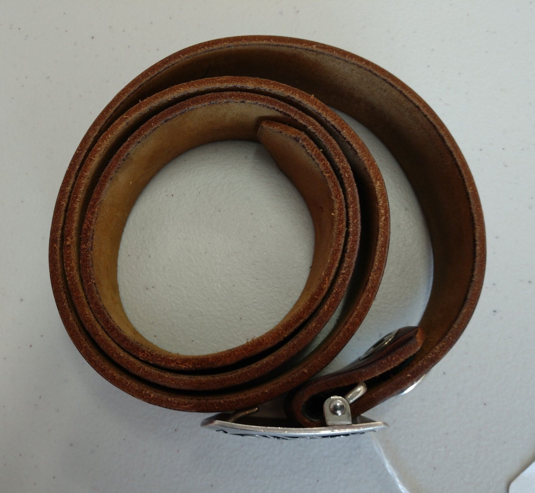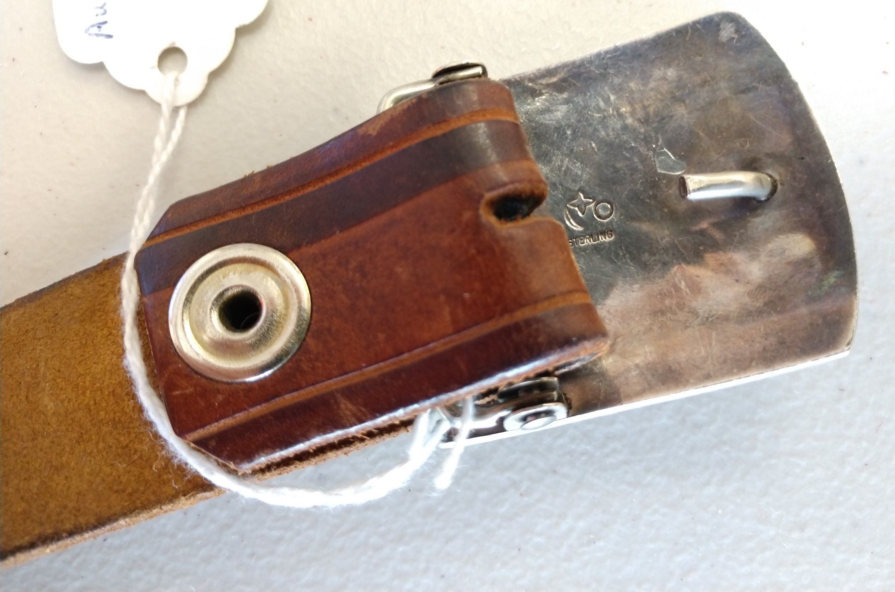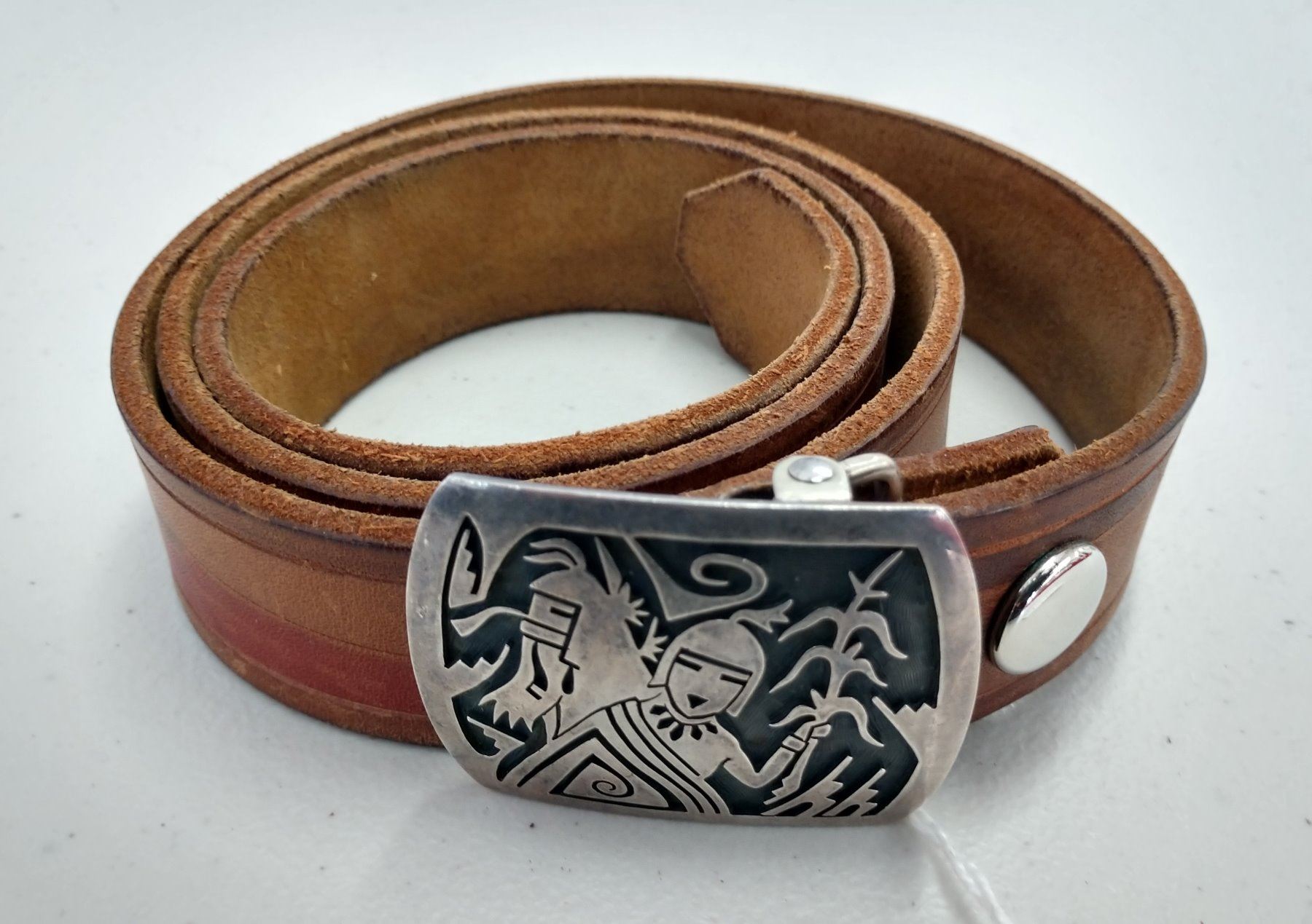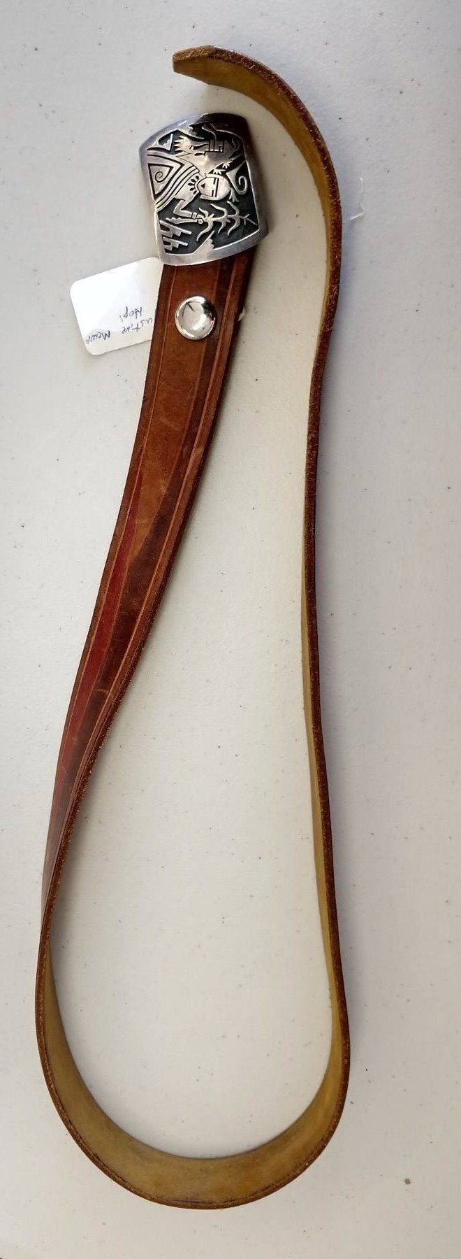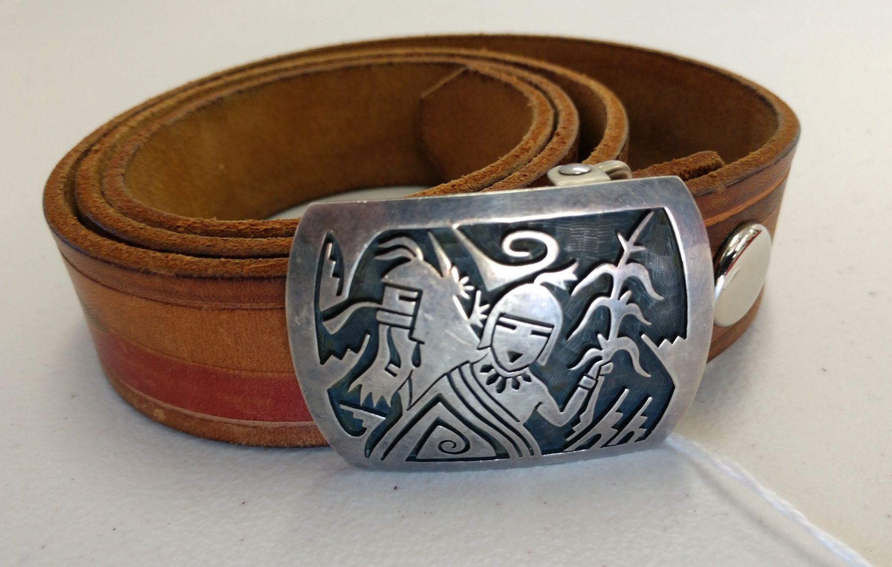 Native American Belt, c. 1960s. Made of paint, leather, and sterling silver buckle, the item measures 40" x 1" and buckle is 2" x 2". Hopi, Arizona. Has kachina figure buckle, red and brown belt, signed Augustine Mowp (?). Condition: Very good, see images. Shipping: $15.50 w/insurance and signature.