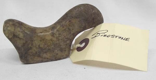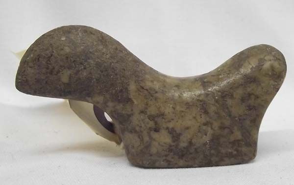Native American Bird Stone Atlatl Piece. The age and origin are unknown on this stone shaped like a bird with a hole drilled in it. Believed to be for use with an Atlatl dart thrower. It measures 1.25''Hx3.25''W.