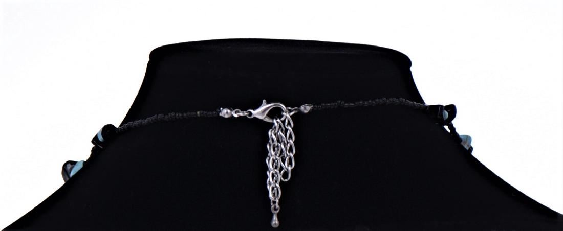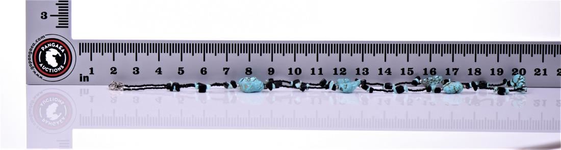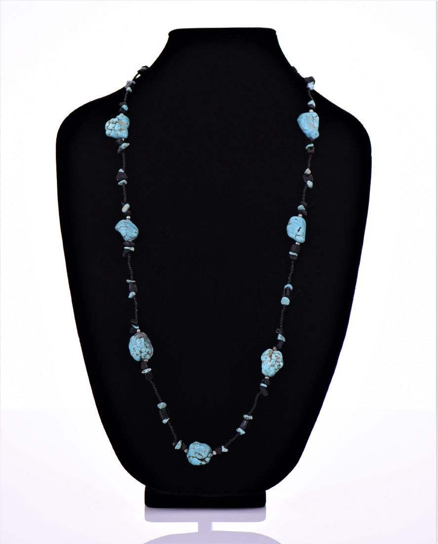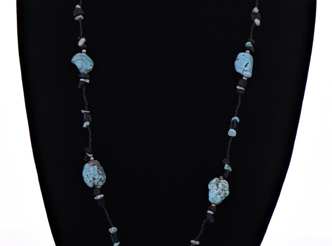 Native American Blue Turquoise And Black Onyx Necklace. With Sterling Silver Beads And Clasp. Silver Tested. Estimated less than 50 yrs old. Native Americans also known as American Indians or just simply Indians are considered to be people whose pre-Columbian ancestors were indigenous to the lands within the nation's modern boundaries. These peoples were composed of numerous distinct tribes, bands, and ethnic groups, and many of these groups survive intact today as partially sovereign nations. The Iroquois, living around the Great Lakes and extending east and north, used strings or belts called wampum that served a dual function: the knots and beaded designs mnemonically chronicled tribal stories and legends, and further served as a medium of exchange and a unit of measure. The keepers of the articles were seen as tribal dignitaries. Pueblo peoples crafted impressive items associated with their religious ceremonies. Kachina dancers wore elaborately painted and decorated masks as they ritually impersonated various ancestral spirits. Sculpture was not highly developed, but carved stone and wood fetishes were made for religious use. Superior weaving, embroidered decorations, and rich dyes characterized the textile arts. Both turquoise and shell jewelry were created, as were high-quality pottery and formalized pictorial arts. Navajo spirituality focused on the maintenance of a harmonious relationship with the spirit world, often achieved by ceremonial acts, usually incorporating sand painting. The colors made from sand, charcoal, cornmeal, and pollen depicted specific spirits. These vivid, intricate, and colorful sand creations were erased at the end of the ceremony. (Wikipedia) Size and/or Weight: See Measurement Photo. (Photos Represent The Lot Condition.)