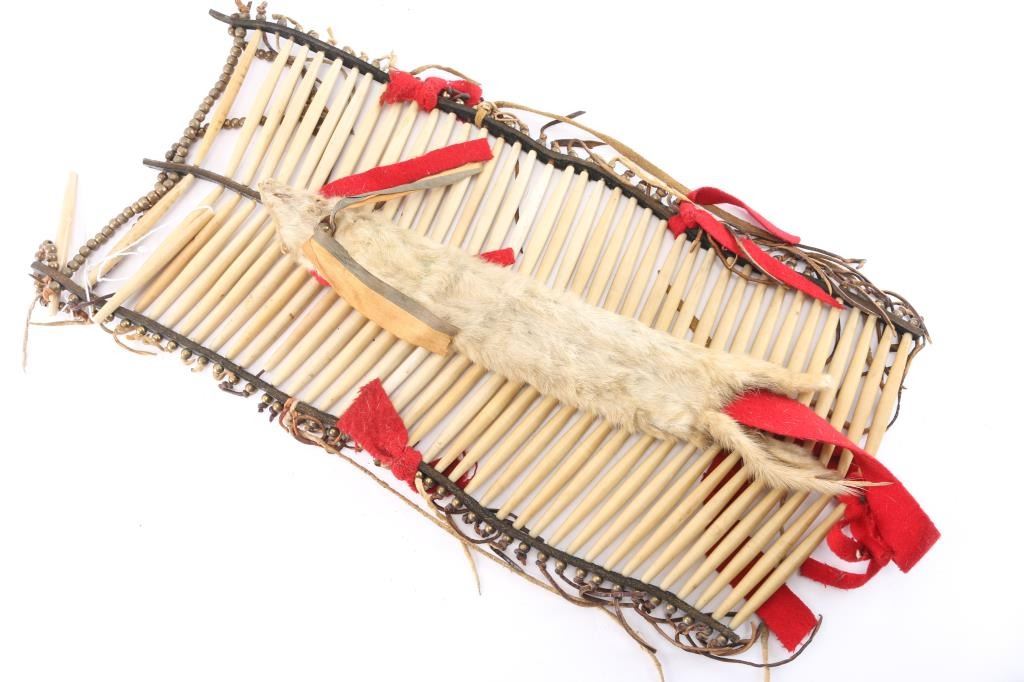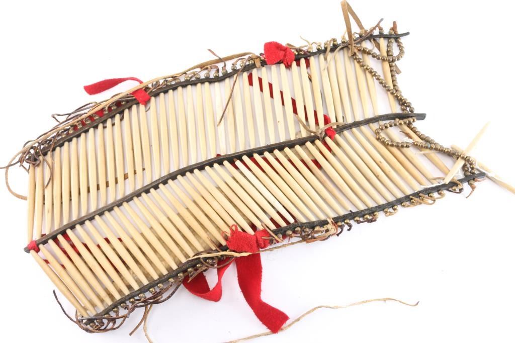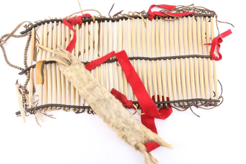 Measures 24" x 10", made of bone, brass beads, leather, red felt, and a small animal hide.