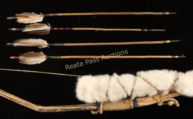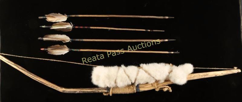 Repro wood branch bow wrapped in twine with a white rabbit fur quiver that includes 4 arrows. Great wall hanger.