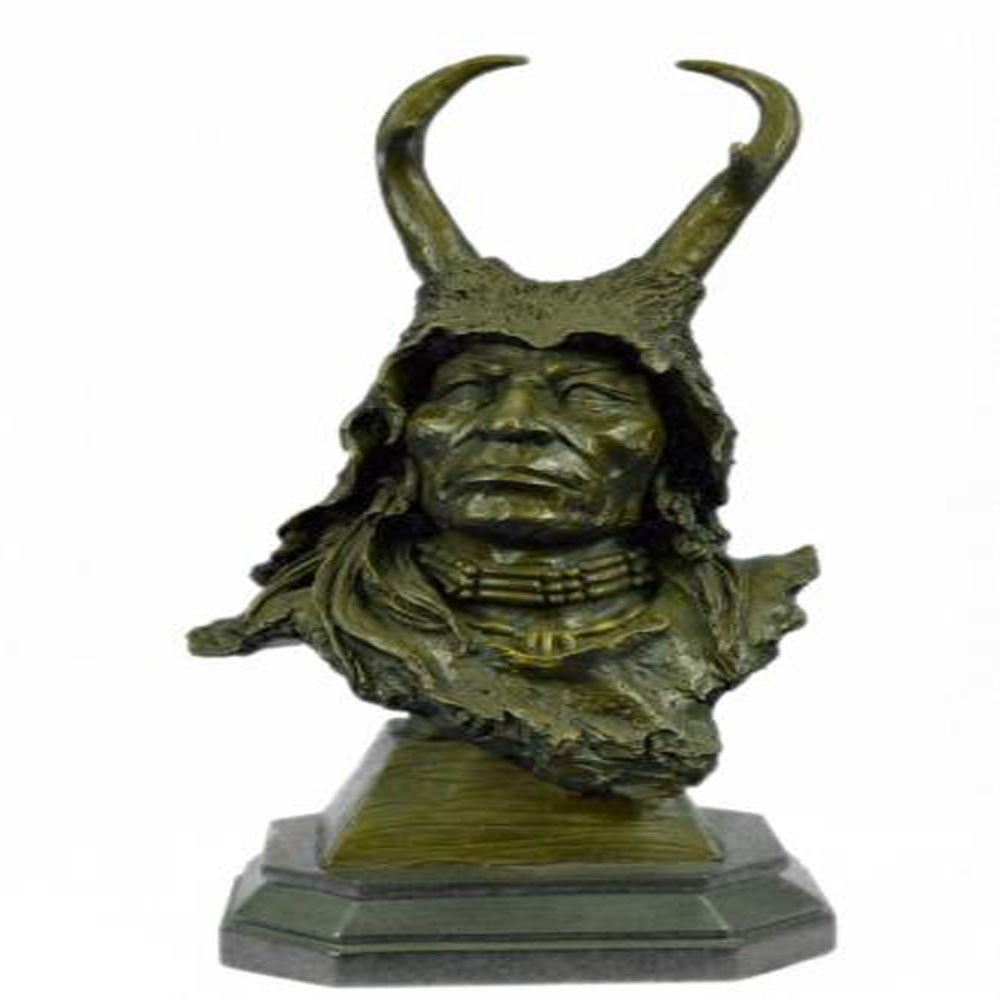 The artist Kamiko designed this piece. His work primarily features Warriors of various periods and cultures. This bust is of a Viking warrior. The horns of his helmet extend and curve upwards almost touching each other. The warrior appears more human than the fierce depictions of Viking Warriors that exist. The Sculpture was crafted using the lost wax method and is on a marble base. Dimensions: Height 17 X Width 9 inches. Weight: 17 LBS.