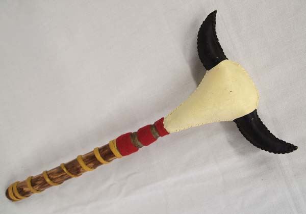 Native American Buffalo Hide Rattle, wooden handle is wrapped in leather and felt, measures 16''L x 7''W