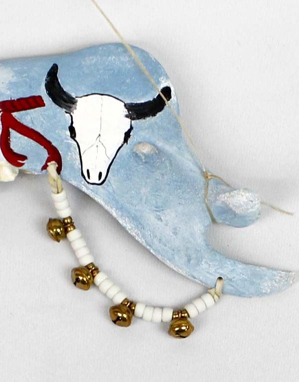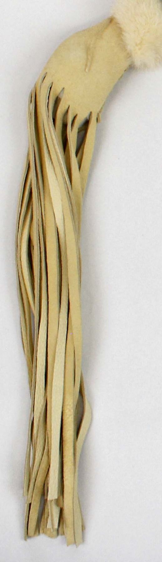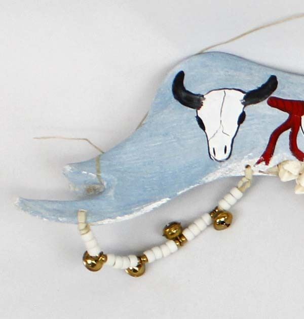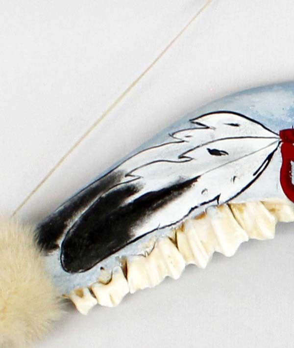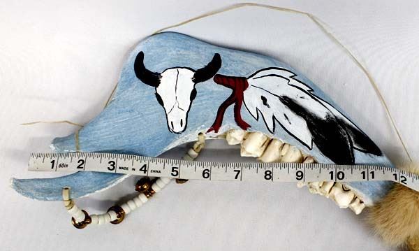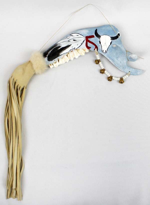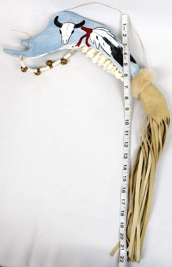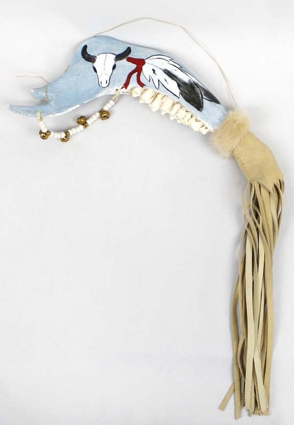 Native American Mohawk Cheyenne Buffalo Jawbone War Club by Leonard and Amalia (Apache) FourHawks, measures 7'' x 15'' which does not include the fringe, embellished with fur, leather, beads, and bells, hand painted