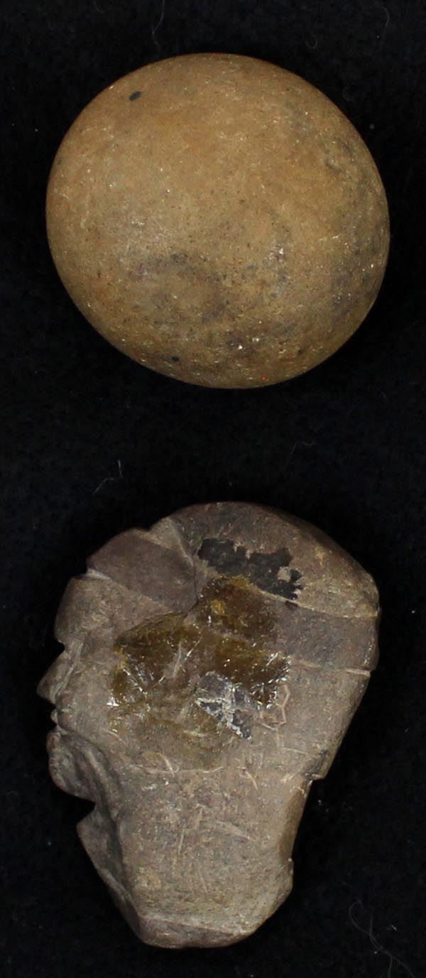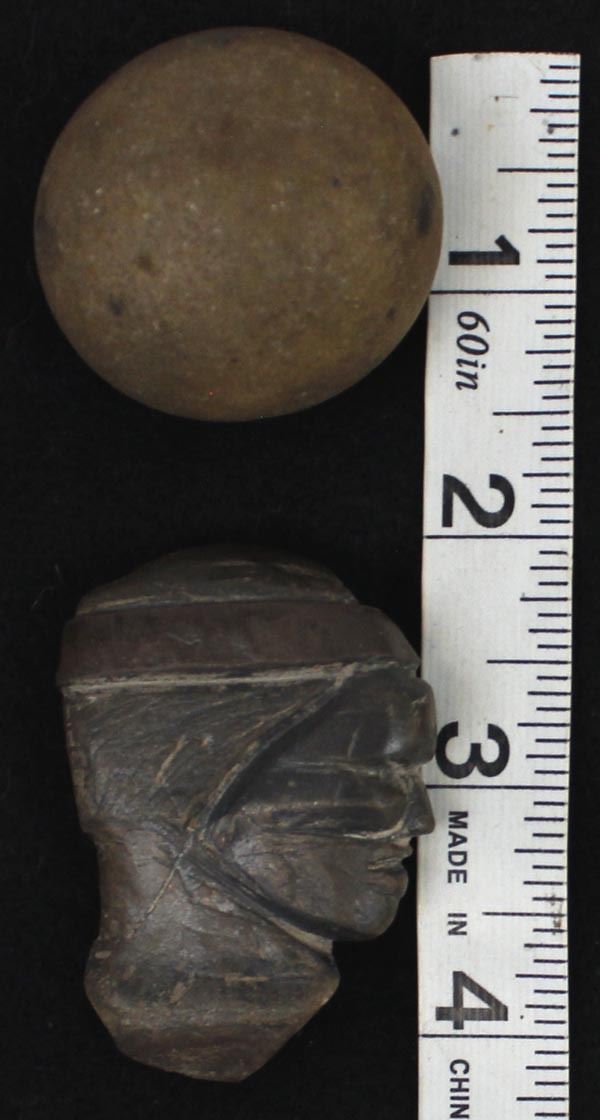 Native American Burnishing or Gaming Stone Ball and Carved Stone Head Effigy, age and origin unknown, effigy measures 2''L x 1.5''W, ball measures 1.5''D