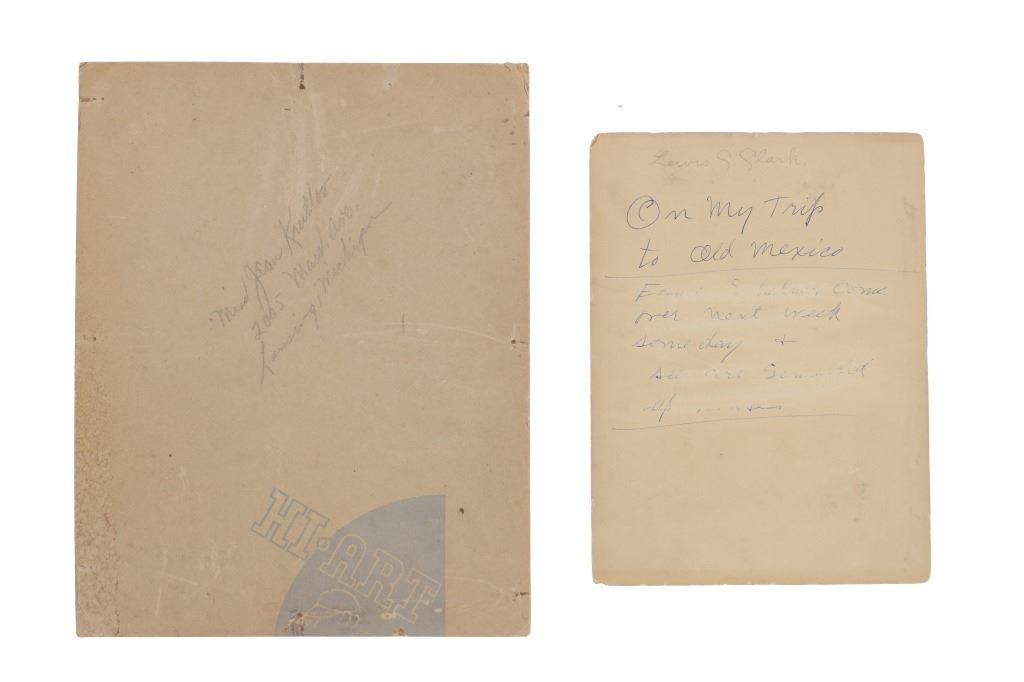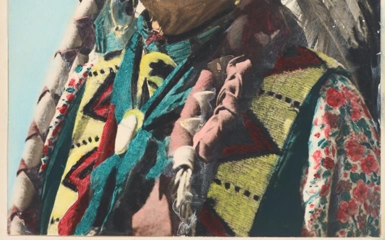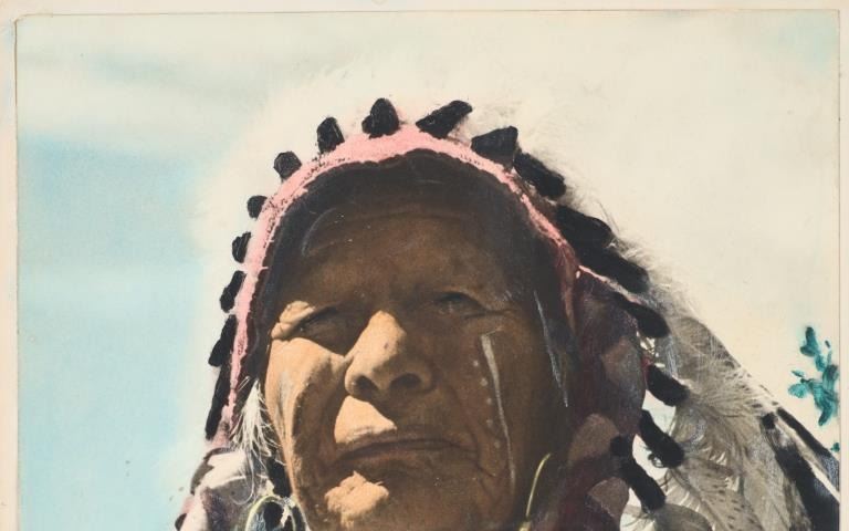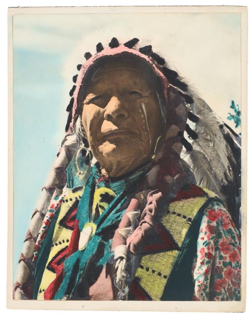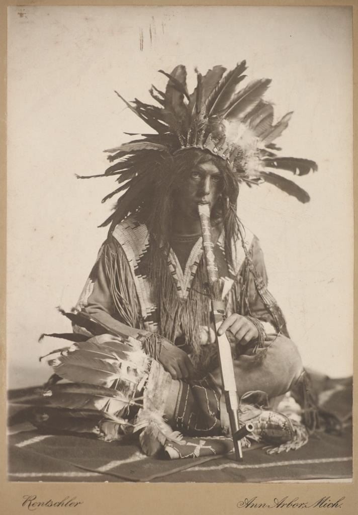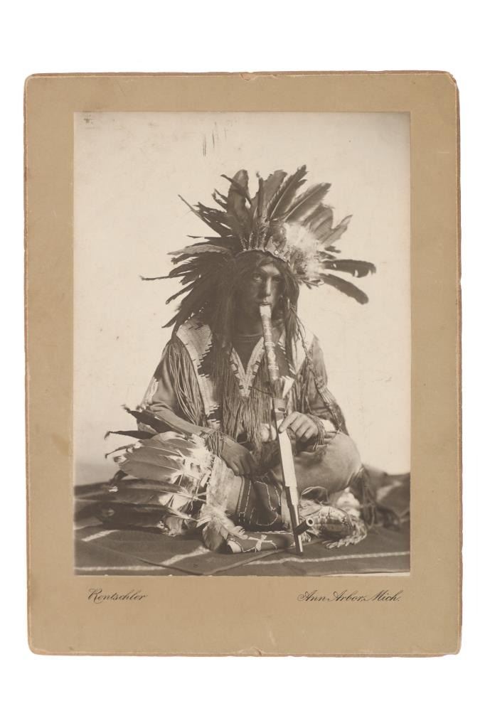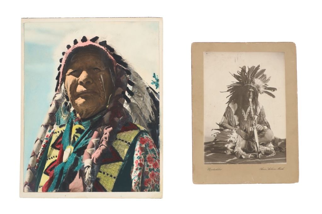 For your consideration are two cabinet card photos of American men from the early 1920-40s. The first and smaller photo was take by Fred Rentschler in Ann Arbor, Michigan in the early 1920s. J. Fred Rentschler (1868–1940) was a prominent portrait photographer based in Ann Arbor, Michigan, who apprenticed with the photography firm Lewis and Gibson before establishing his own studio in 1890 at the corner of Main and Huron streets. As his business grew, he relocated in 1904 to 319 East Huron Street, constructing a studio with a two-story glass wall to maximize natural light. Rentschler's studio became the go-to place for portraits of mayors, businessmen, service organization officers, ministers, and University of Michigan presidents from James Angell onward. He also photographed leading professors and major sports teams, including the university's football team. In 1926, his son Edwin joined the business, continuing the tradition until 1969. The Rentschler studio remained a cornerstone of Ann Arbor's photographic history for over eight decades, capturing countless images that documented the city's social and academic life. His photo shows a Native American man sitting in his studio getting photographed. He is wearing traditional clothing and a feather headdress as he smokes a large tobacco pipe. The bottom of the photo reads, "Rentschler / Ann Arbor, Mich.". The second and larger photo is hand colored and shows a Native American man looking down towards the camera as his photo is being taken. It is brightly colored and shows a small section near the headdress that is uncolored. The photos show good condition overall with slight wear present from their age and use over the years but no signs of damage noted. The smaller visible photo measures 6 1/4" L x 4 1/2" W, while the entire piece measures 7 7/8" L x 5 7/8" W. The larger photo measures 10" L x 7 7/8" W.*
