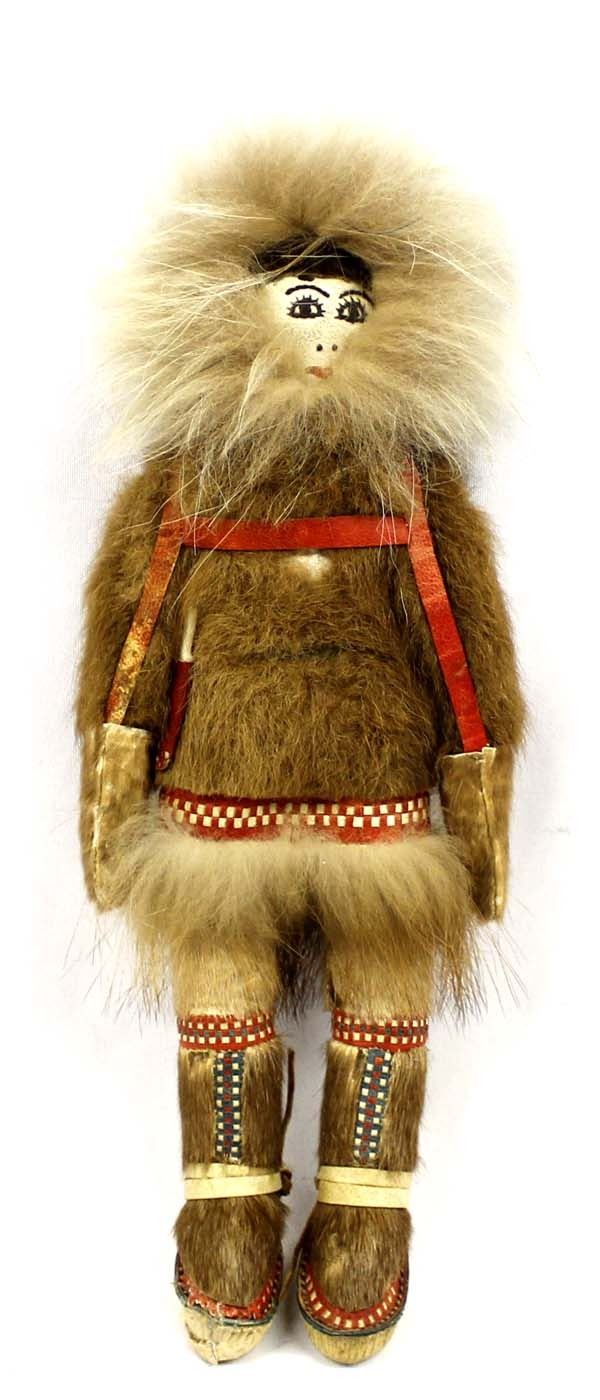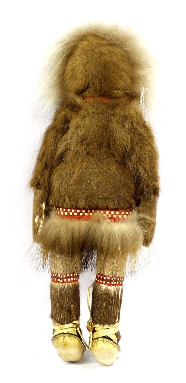 Native American Canadian Inuit Doll, measures 13''L x 5'', wearing traditional fur parka and leggings, hand painted face on leather, some damage to right boot